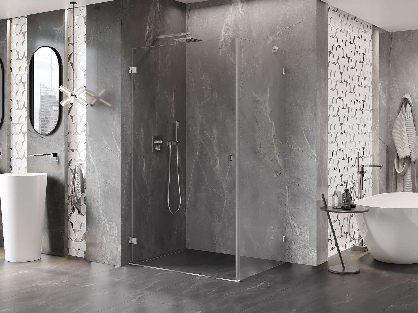 Handige en comfortabele greep is gemaakt van duurzaam en weerbestendig metaal. De modieuze vorm in combinatie met een afwerking die past bij de kleur van de profielen geeft het geheel een moderne en stijlvolle uitstraling, wat de esthetiek van elke badkamer benadrukt.