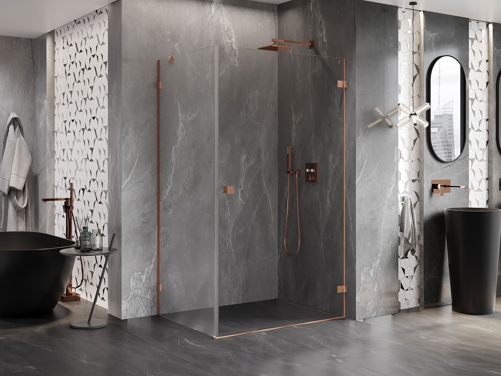 Handige en comfortabele greep is gemaakt van duurzaam en weerbestendig metaal. De modieuze vorm in combinatie met een afwerking die past bij de kleur van de profielen geeft het geheel een moderne en stijlvolle uitstraling, wat de esthetiek van elke badkamer benadrukt.