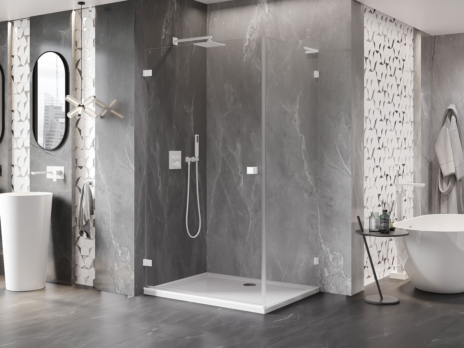 Handige en comfortabele greep is gemaakt van duurzaam en weerbestendig metaal. De modieuze vorm in combinatie met een afwerking die past bij de kleur van de profielen geeft het geheel een moderne en stijlvolle uitstraling, wat de esthetiek van elke badkamer benadrukt.