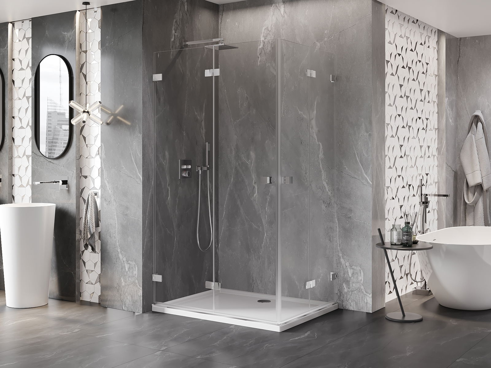 Handige en comfortabele greep is gemaakt van duurzaam en weerbestendig metaal. De modieuze vorm in combinatie met een afwerking die past bij de kleur van de profielen geeft het geheel een moderne en stijlvolle uitstraling, wat de esthetiek van elke badkamer benadrukt.