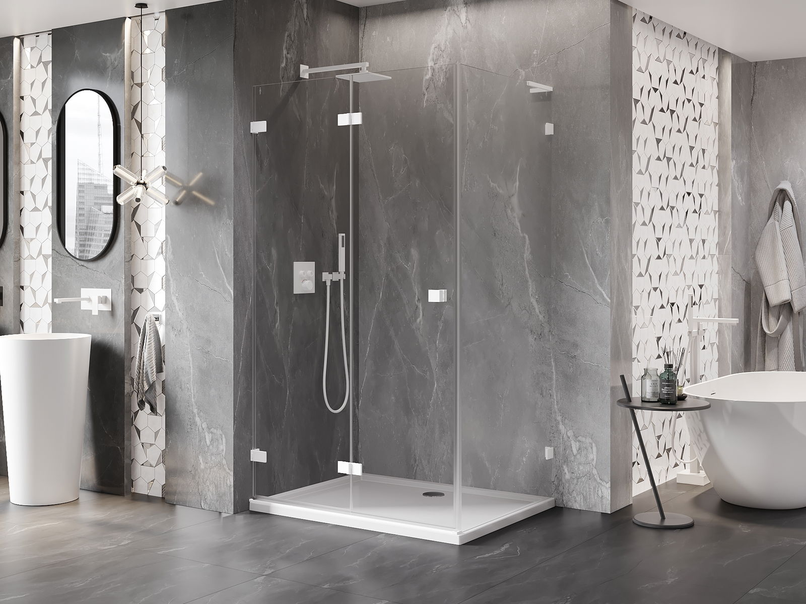 Handige en comfortabele greep is gemaakt van duurzaam en weerbestendig metaal. De modieuze vorm in combinatie met een afwerking die past bij de kleur van de profielen geeft het geheel een moderne en stijlvolle uitstraling, wat de esthetiek van elke badkamer benadrukt.