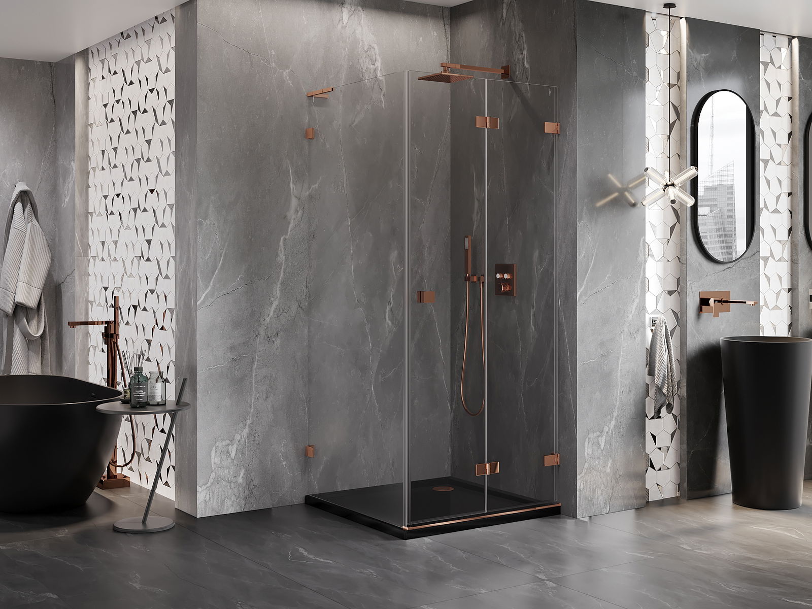 Handige en comfortabele greep is gemaakt van duurzaam en weerbestendig metaal. De modieuze vorm in combinatie met een afwerking die past bij de kleur van de profielen geeft het geheel een moderne en stijlvolle uitstraling, wat de esthetiek van elke badkamer benadrukt.