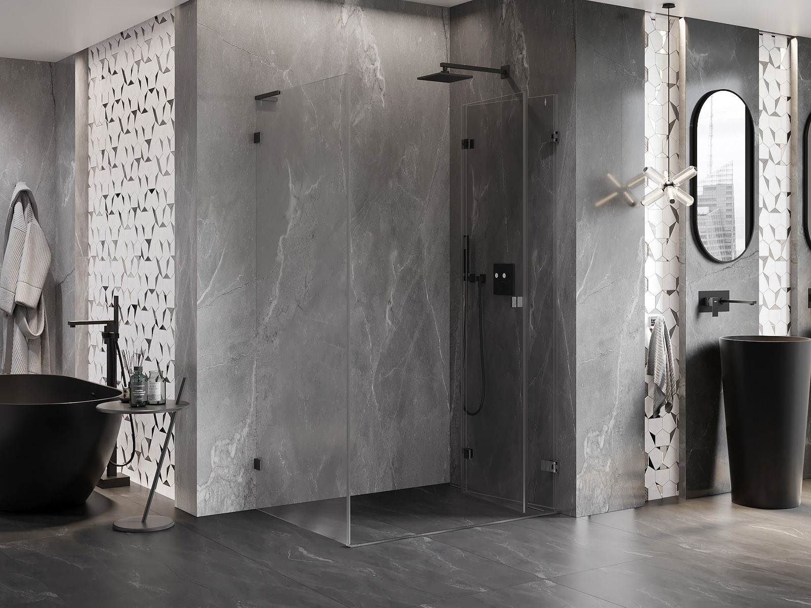 Handige en comfortabele greep is gemaakt van duurzaam en weerbestendig metaal. De modieuze vorm in combinatie met een afwerking die past bij de kleur van de profielen geeft het geheel een moderne en stijlvolle uitstraling, wat de esthetiek van elke badkamer benadrukt.