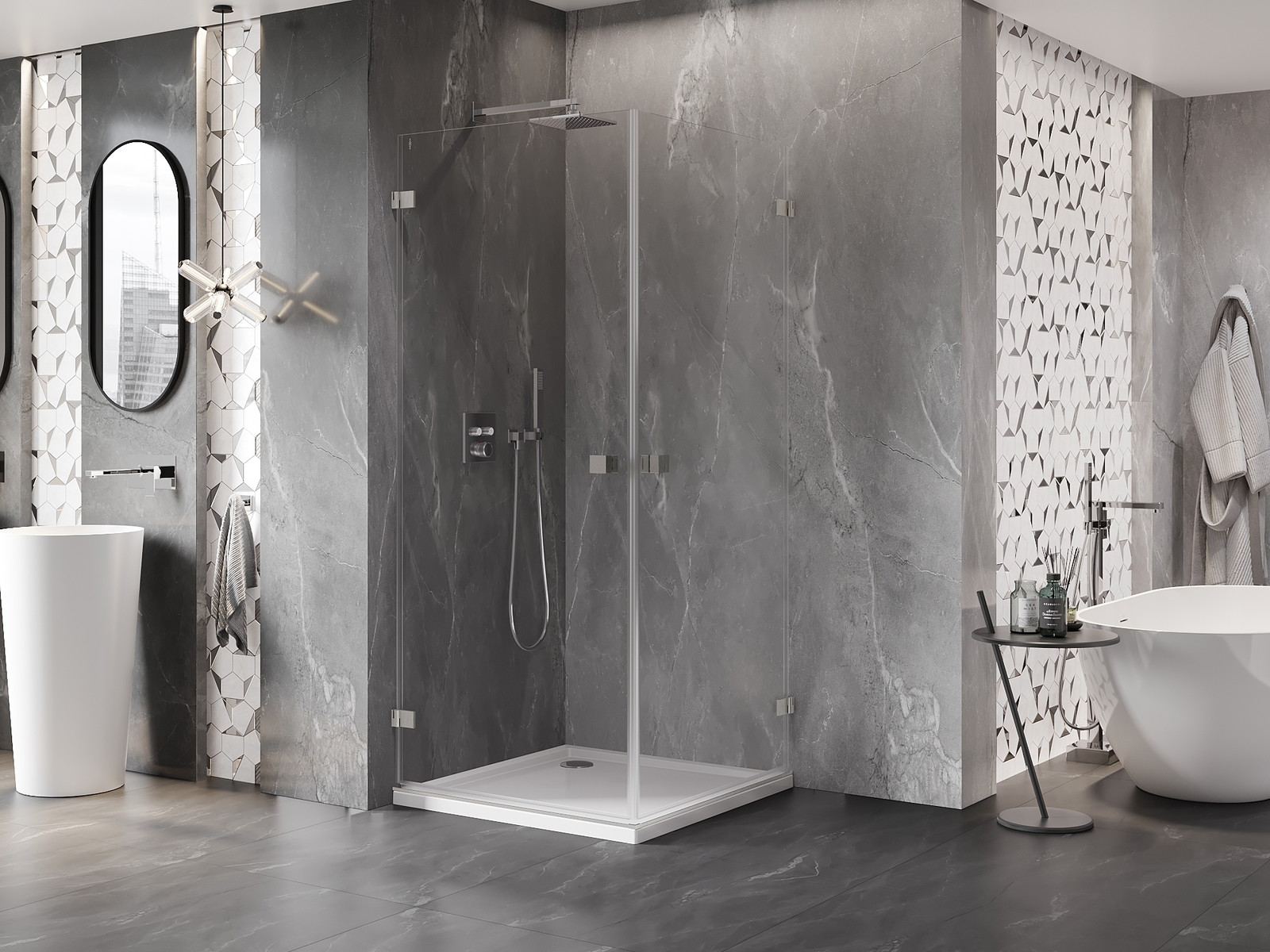 Draaideuren bieden maximale vrijheid tijdens het gebruik. Ze hebben stevige scharnieren gemaakt van duurzaam materiaal, die gemakkelijk schoon te houden zijn en gemakkelijke toegang tot het interieur van de cabine bieden.