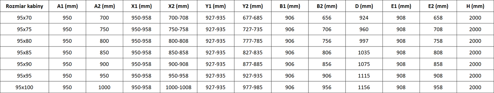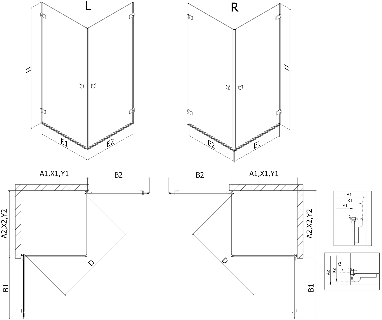 Douchecabines, deuren en wanden zijn standaard geschikt voor montage op douchebakken van specifieke afmetingen. Deze afmetingen worden vermeld in de productnaam of beschrijving. Houd er echter rekening mee dat de werkelijke afmetingen van de elementen enigszins kunnen afwijken van de nominale waarden. Bij montage direct op de vloer wordt aangeraden de buitenmaten en de plaatsing van de elementen nauwkeurig te controleren aan de hand van de technische tekening.