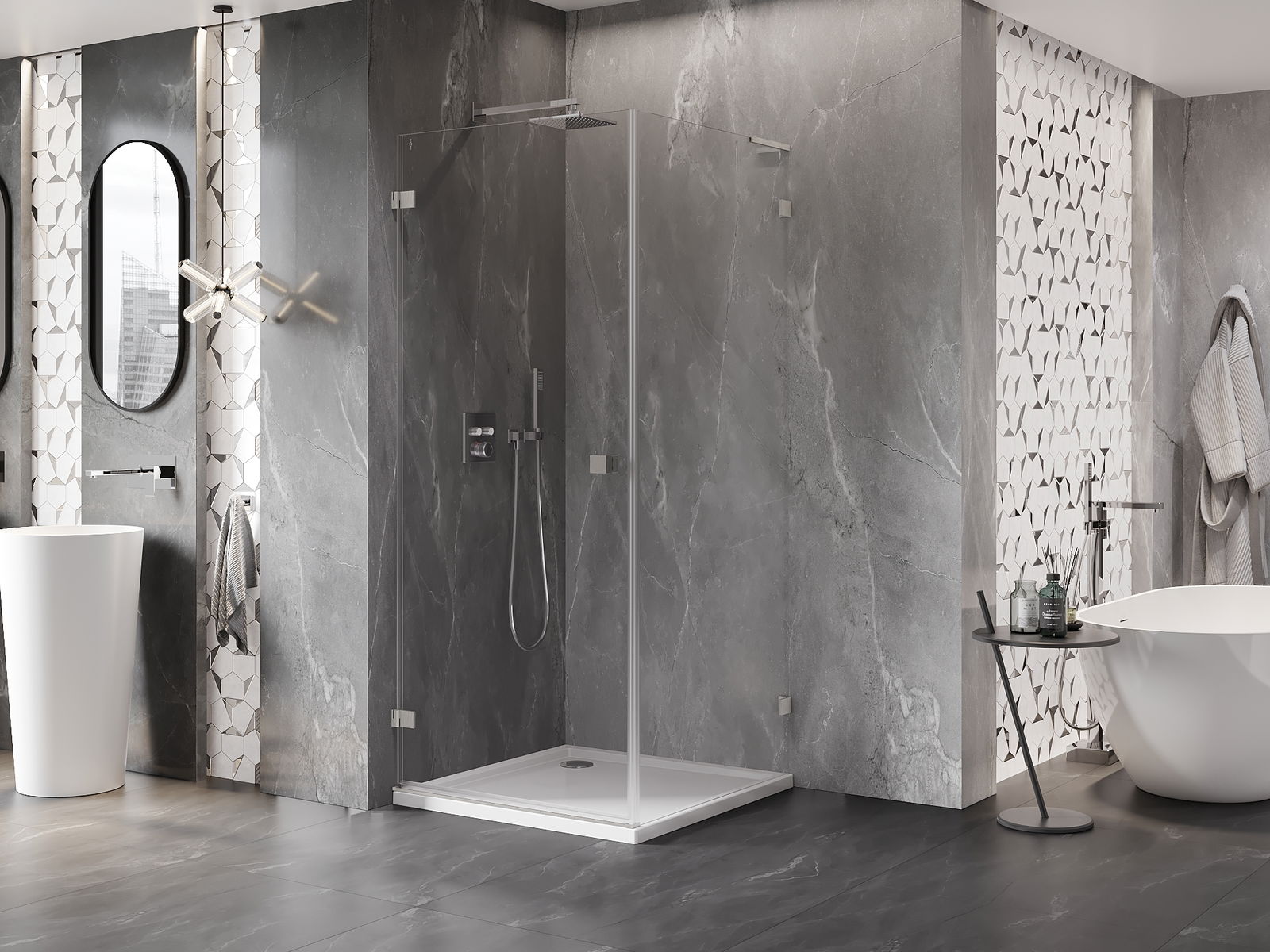 Handige en comfortabele greep is gemaakt van duurzaam en weerbestendig metaal. De modieuze vorm in combinatie met een afwerking die past bij de kleur van de profielen geeft het geheel een moderne en stijlvolle uitstraling, wat de esthetiek van elke badkamer benadrukt.