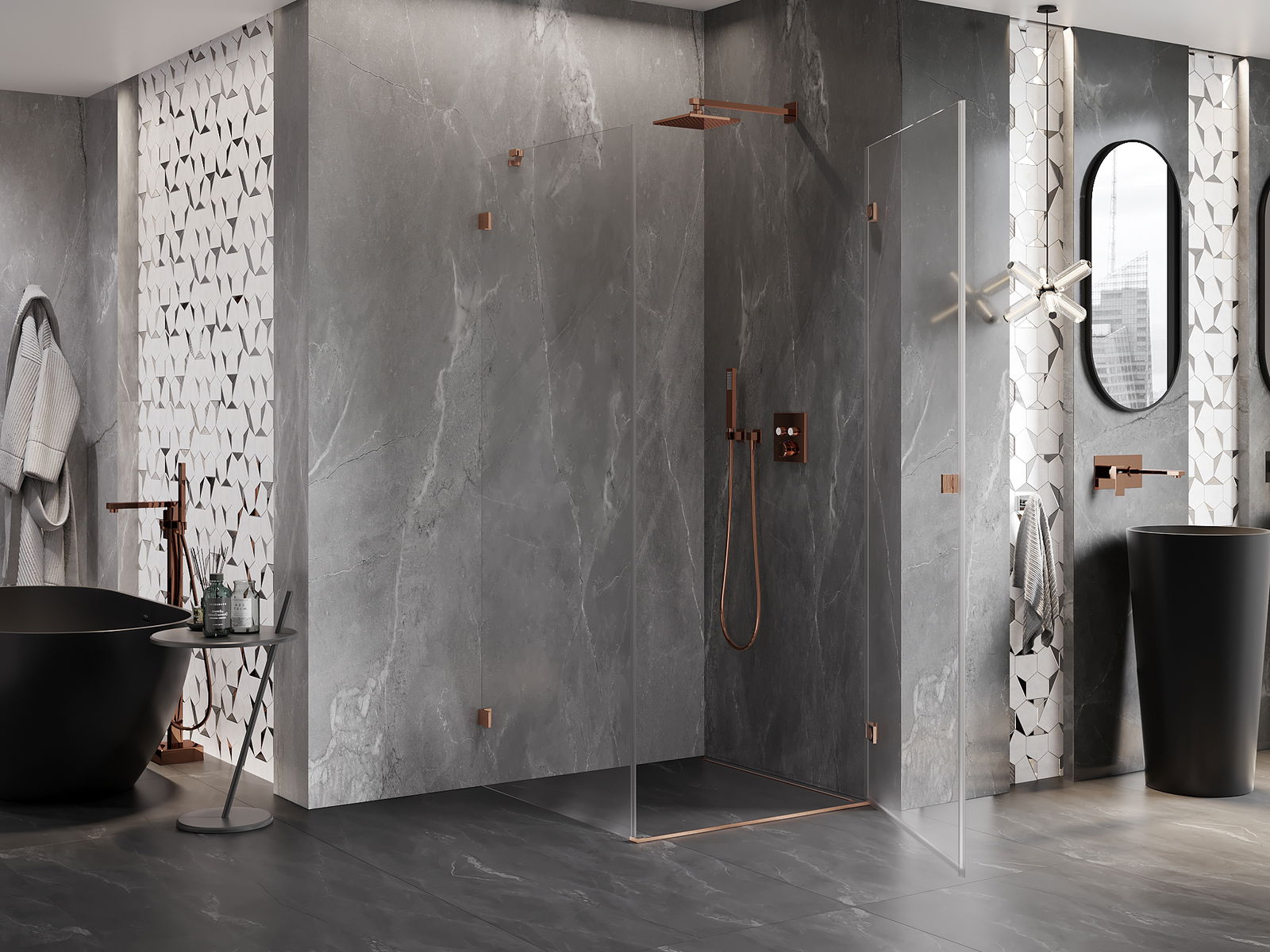 De klemmen zijn gemaakt van zeer duurzaam messing en creëren een vlak glazen oppervlak. Het is een uitstekende keuze die elegantie, duurzaamheid en modern design combineert. Dankzij dergelijke oplossingen wint de douche aan esthetiek en tegelijkertijd vergemakkelijken ze het onderhoud van de netheid.