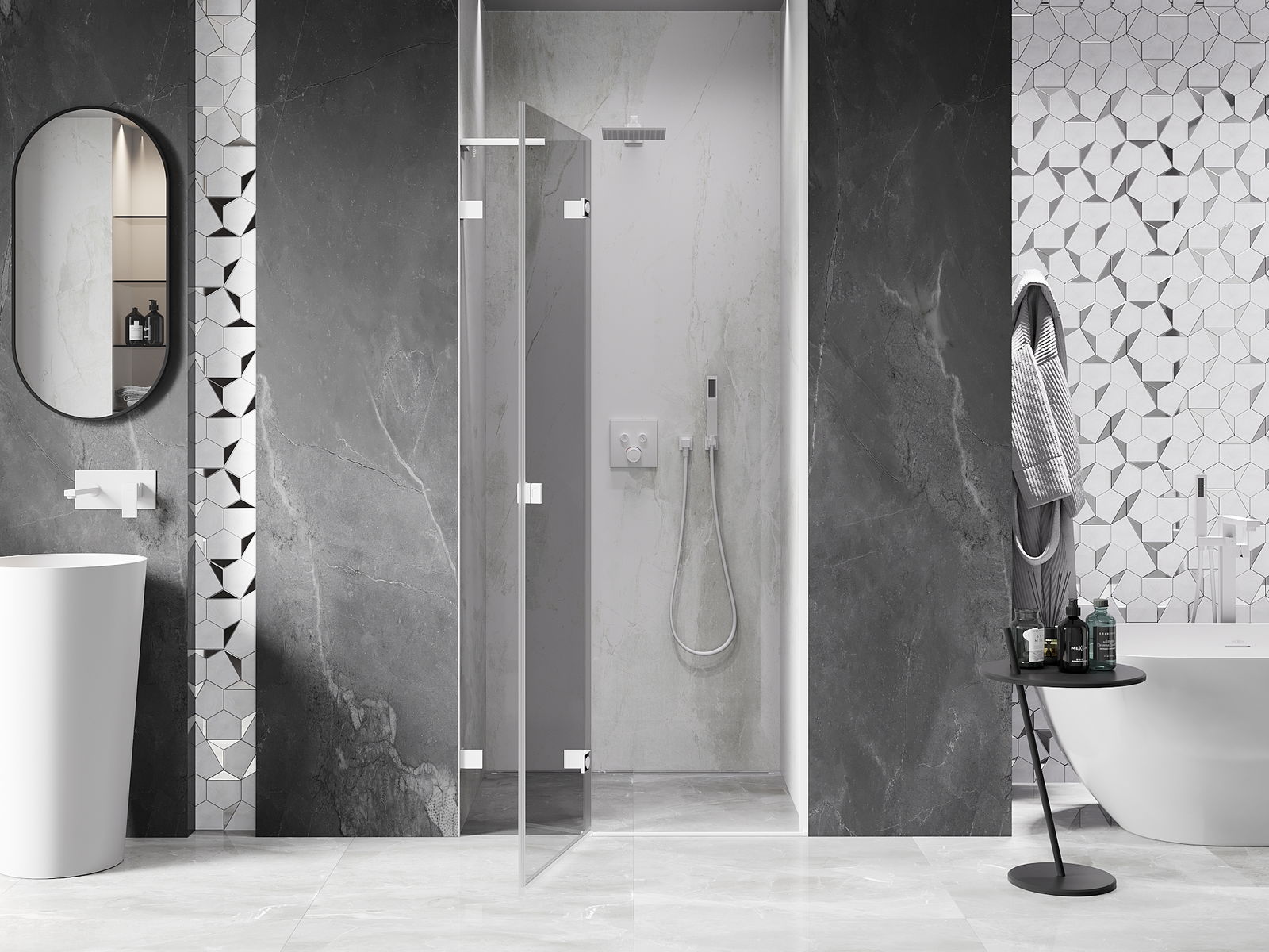 Draaideuren bieden maximale vrijheid tijdens het gebruik. Ze hebben stevige scharnieren gemaakt van duurzaam materiaal, die gemakkelijk schoon te houden zijn en gemakkelijke toegang tot het interieur van de cabine bieden.