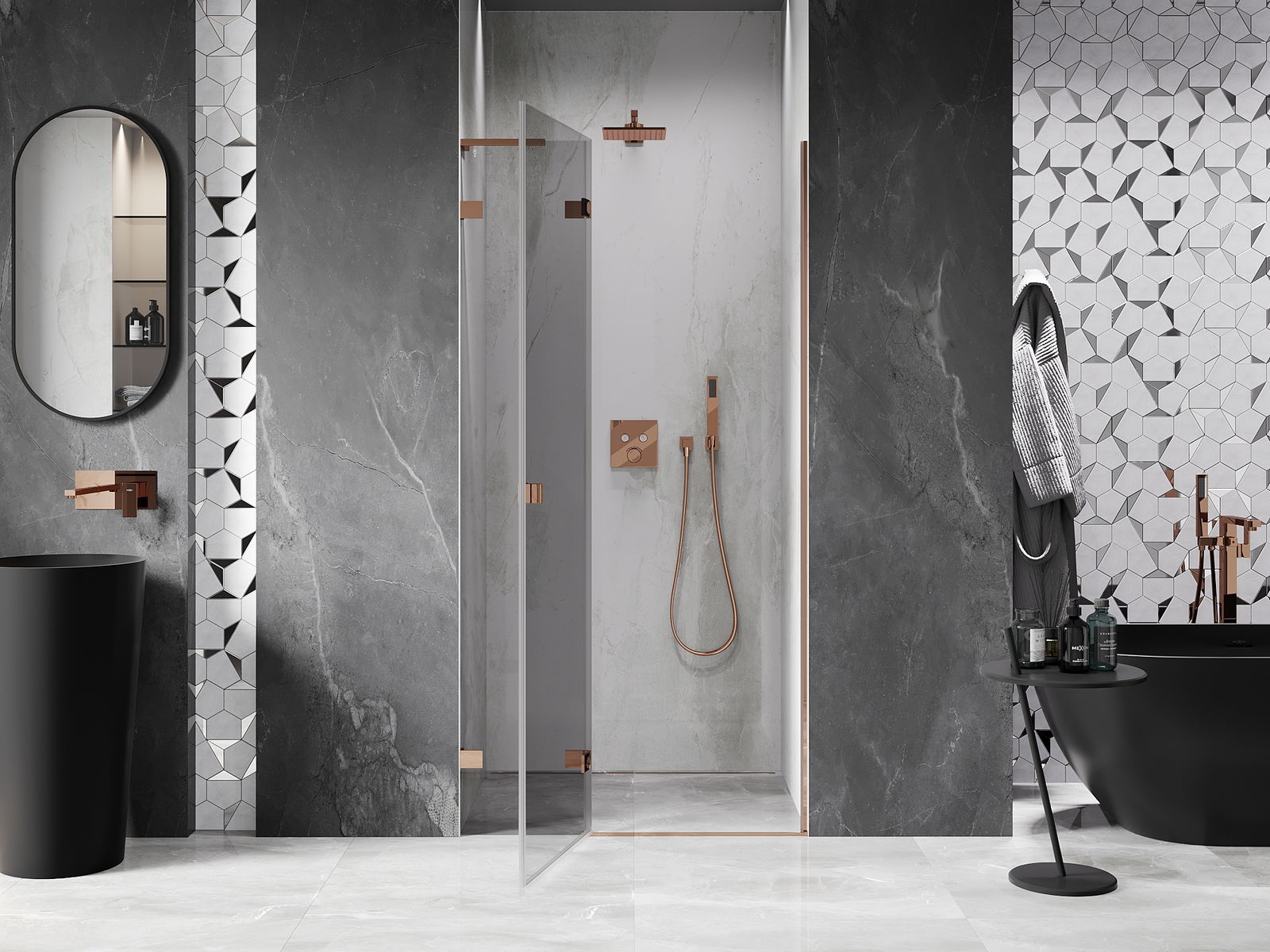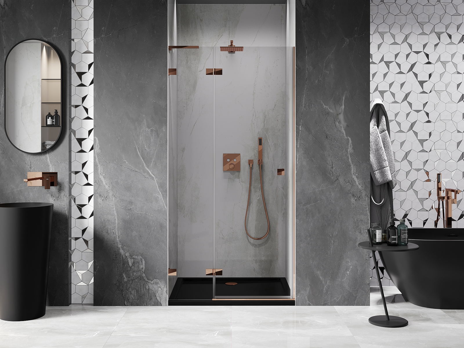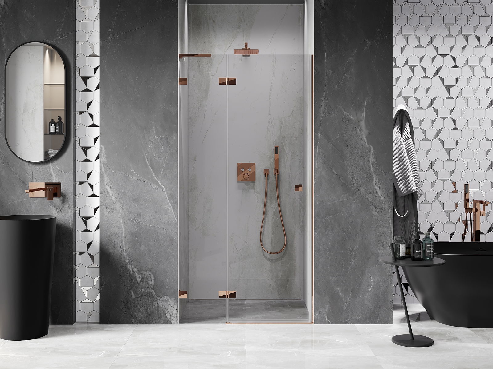 Handige en comfortabele greep is gemaakt van duurzaam en weerbestendig metaal. De modieuze vorm in combinatie met een afwerking die past bij de kleur van de profielen geeft het geheel een moderne en stijlvolle uitstraling, wat de esthetiek van elke badkamer benadrukt.