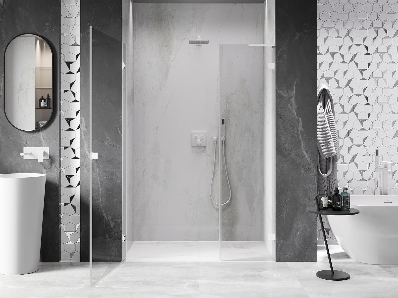 Handige en comfortabele greep is gemaakt van duurzaam en weerbestendig metaal. De modieuze vorm in combinatie met een afwerking die past bij de kleur van de profielen geeft het geheel een moderne en stijlvolle uitstraling, wat de esthetiek van elke badkamer benadrukt.