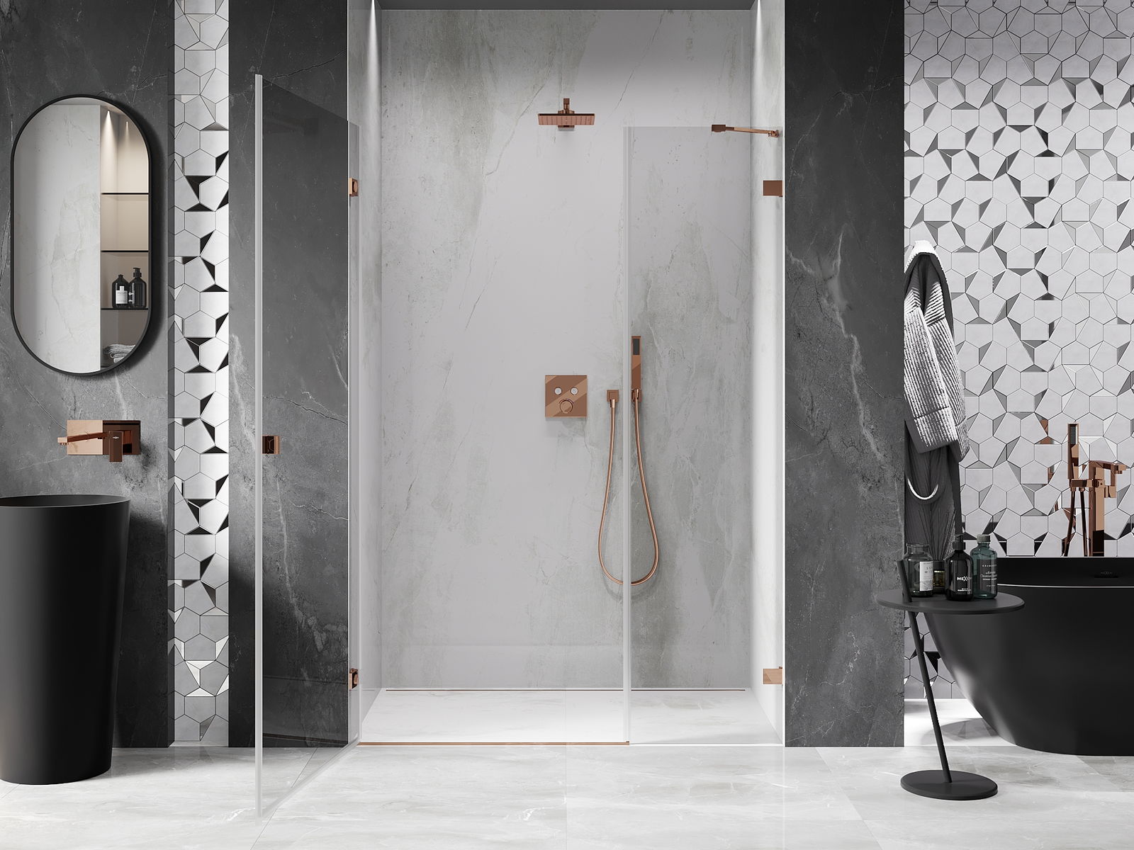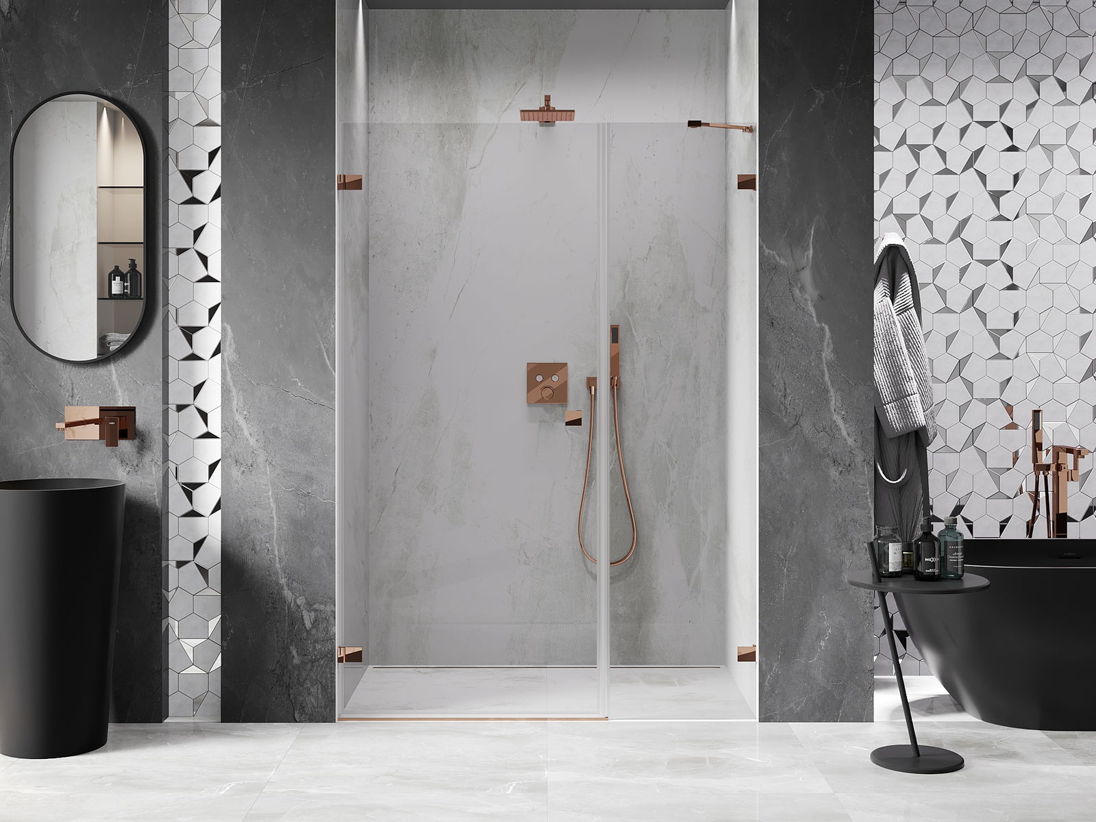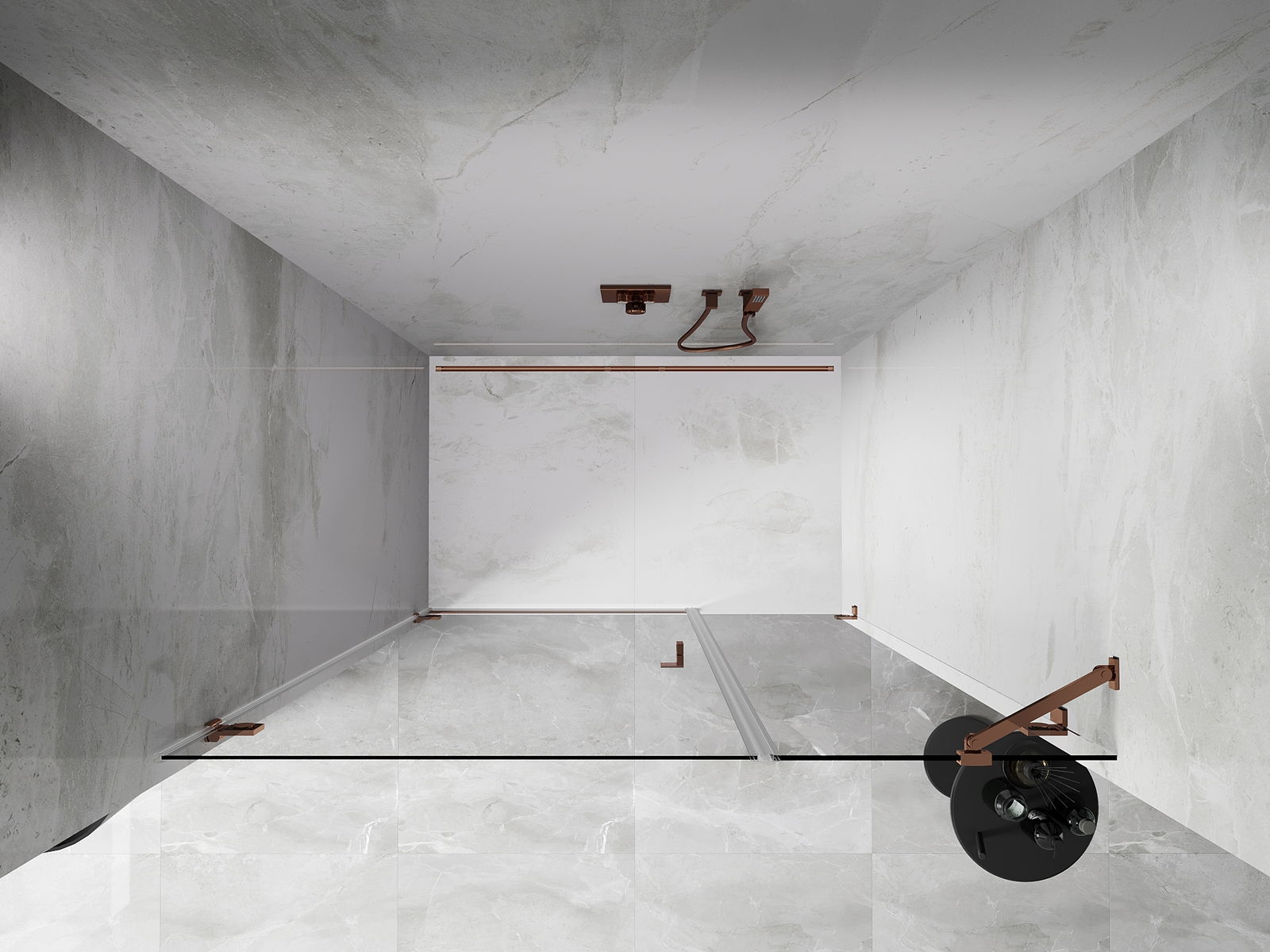 De klemmen zijn gemaakt van zeer duurzaam messing en creëren een vlak glazen oppervlak. Het is een uitstekende keuze die elegantie, duurzaamheid en modern design combineert. Dankzij dergelijke oplossingen wint de douche aan esthetiek en tegelijkertijd vergemakkelijken ze het onderhoud van de netheid.