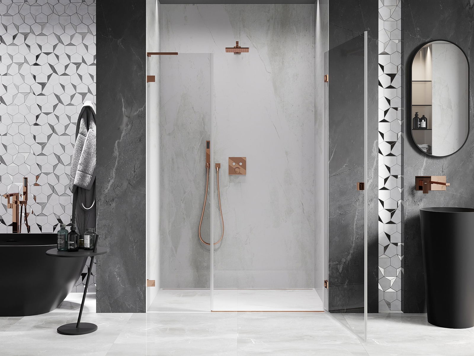 Draaideuren bieden maximale vrijheid tijdens het gebruik. Ze hebben stevige scharnieren gemaakt van duurzaam materiaal, die gemakkelijk schoon te houden zijn en gemakkelijke toegang tot het interieur van de cabine bieden.