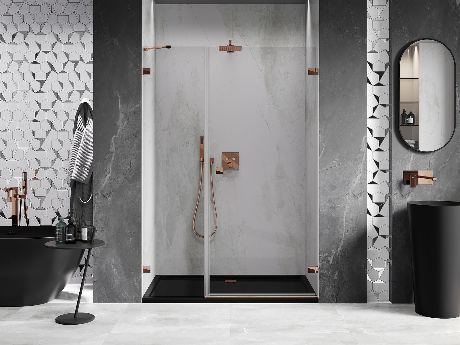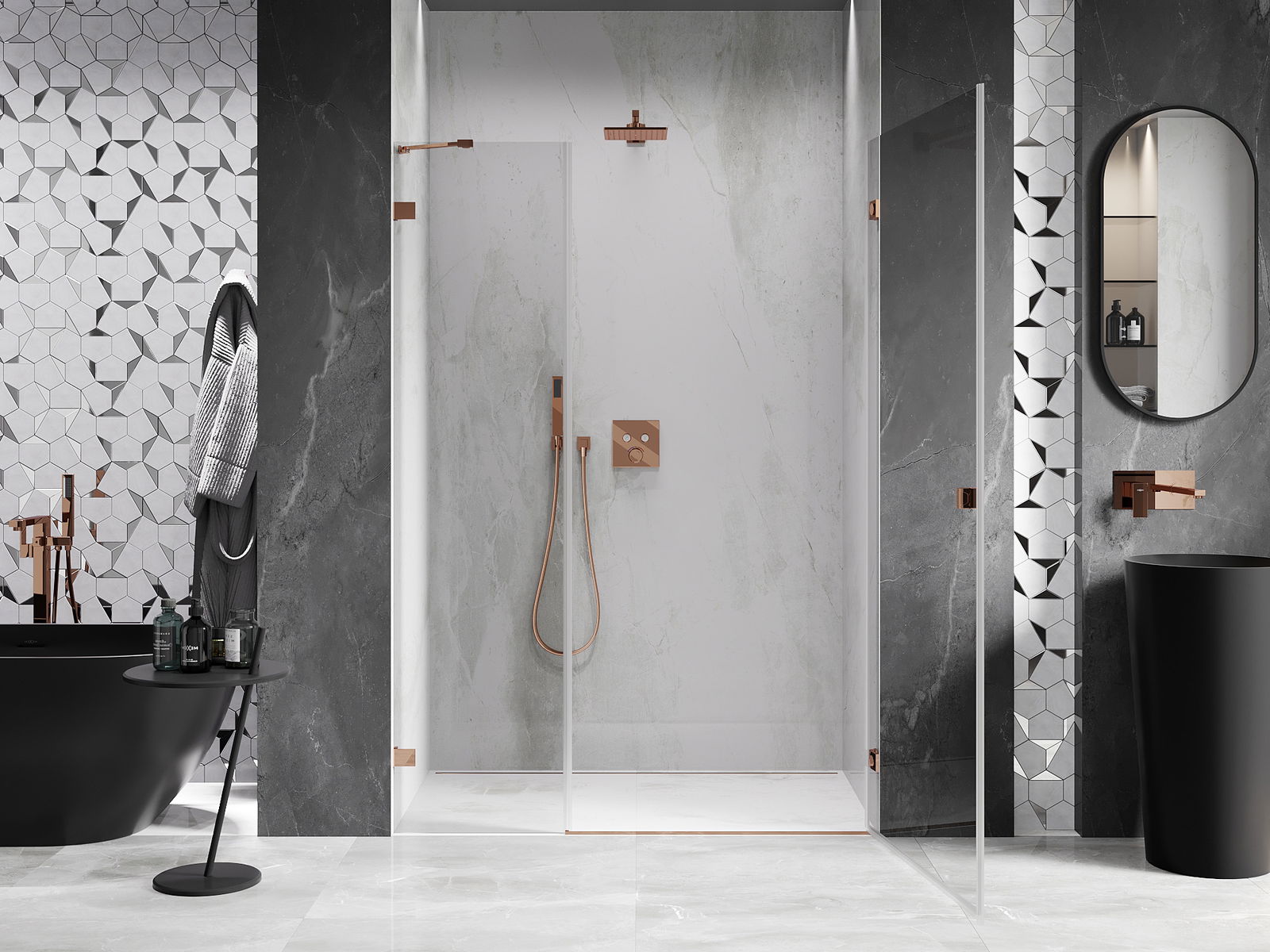 De handige en comfortabele handgreep is gemaakt van duurzaam en stevig metaal. De modieuze vorm, gecombineerd met een afwerking die qua kleur aansluit bij de profielen, geeft het geheel een moderne en stijlvolle uitstraling en versterkt de esthetiek van elke badkamer.