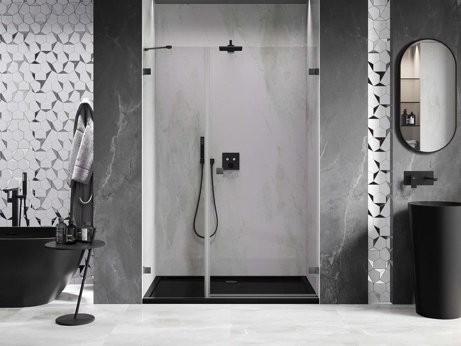 Draaideuren bieden maximale vrijheid tijdens het gebruik. Ze hebben stevige scharnieren gemaakt van duurzaam materiaal, die gemakkelijk schoon te houden zijn en gemakkelijke toegang tot het interieur van de cabine bieden.