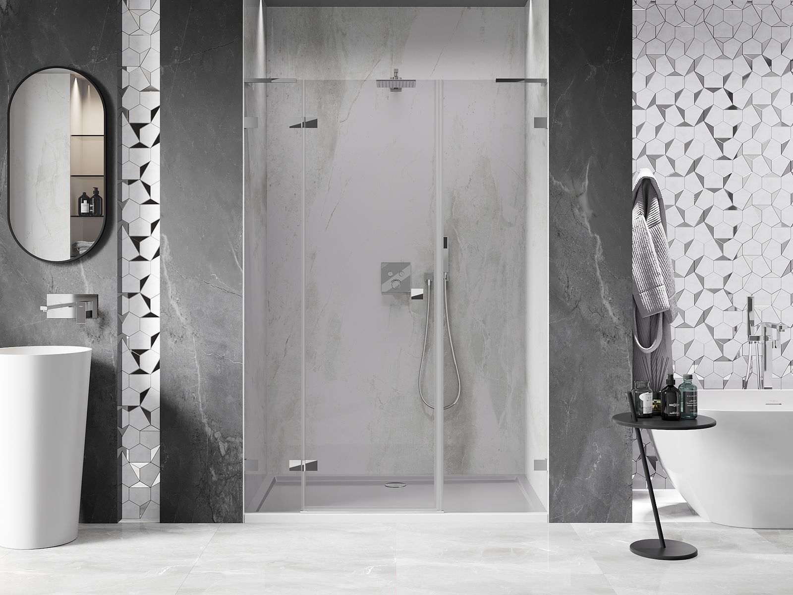 Draaideuren bieden maximale vrijheid tijdens het gebruik. Ze hebben stevige scharnieren gemaakt van duurzaam materiaal, die gemakkelijk schoon te houden zijn en gemakkelijke toegang tot het interieur van de cabine bieden.