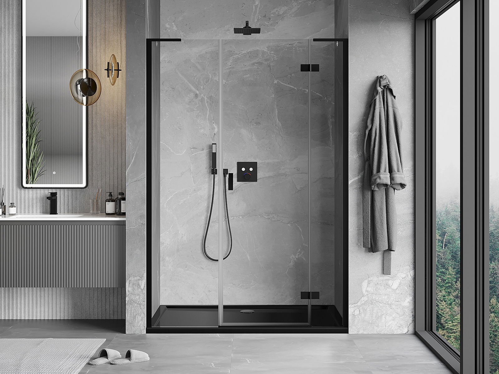 Handige en comfortabele greep is gemaakt van duurzaam en weerbestendig metaal. De modieuze vorm in combinatie met een afwerking die past bij de kleur van de profielen geeft het geheel een moderne en stijlvolle uitstraling, wat de esthetiek van elke badkamer benadrukt.