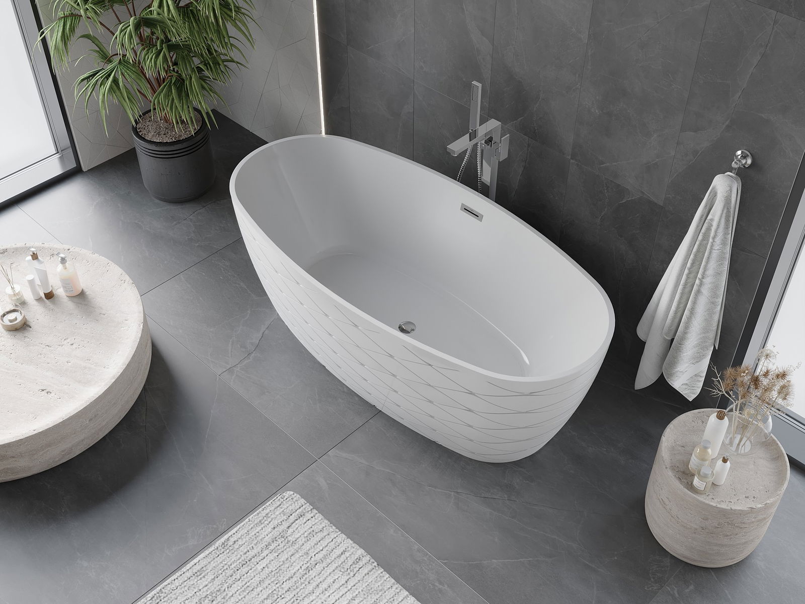 Dit moderne materiaal combineert een elegante uitstraling met een hoge duurzaamheid. Het is bestand tegen mechanische beschadigingen, gemakkelijk schoon te maken en voelt prettig aan. De transparante vorm en dunne rand van het bad geven het een licht en uniek karakter, wat een opvallende accentuering in de badkamer creëert.