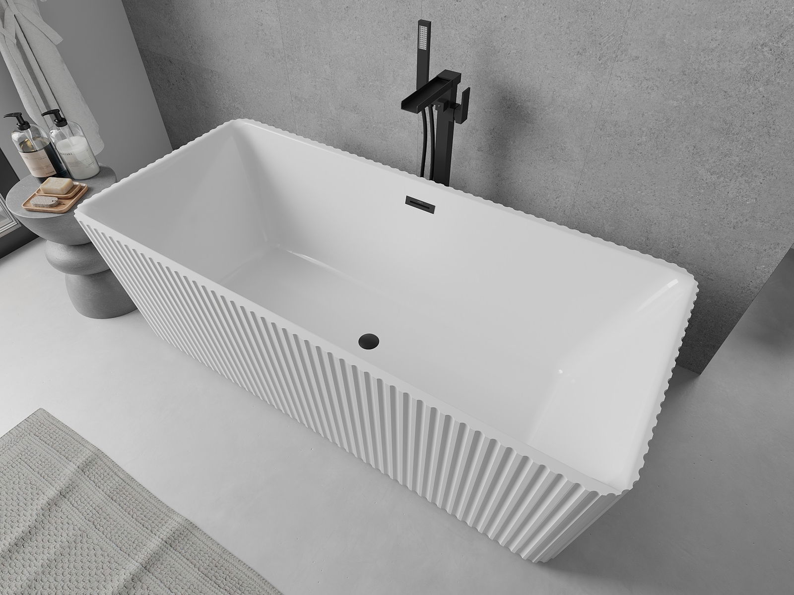Dit moderne materiaal combineert een elegante uitstraling met een hoge duurzaamheid. Het is bestand tegen mechanische beschadigingen, gemakkelijk schoon te maken en voelt prettig aan. De transparante vorm en dunne rand van het bad geven het een licht en uniek karakter, wat een opvallende accentuering in de badkamer creëert.