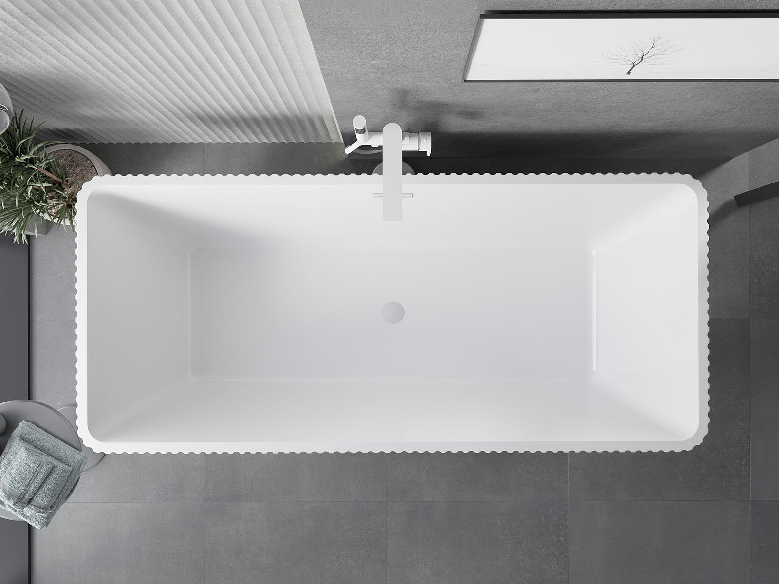 Dit moderne materiaal combineert een elegante uitstraling met een hoge duurzaamheid. Het is bestand tegen mechanische beschadigingen, gemakkelijk schoon te maken en voelt prettig aan. De transparante vorm en dunne rand van het bad geven het een licht en uniek karakter, wat een opvallende accentuering in de badkamer creëert.