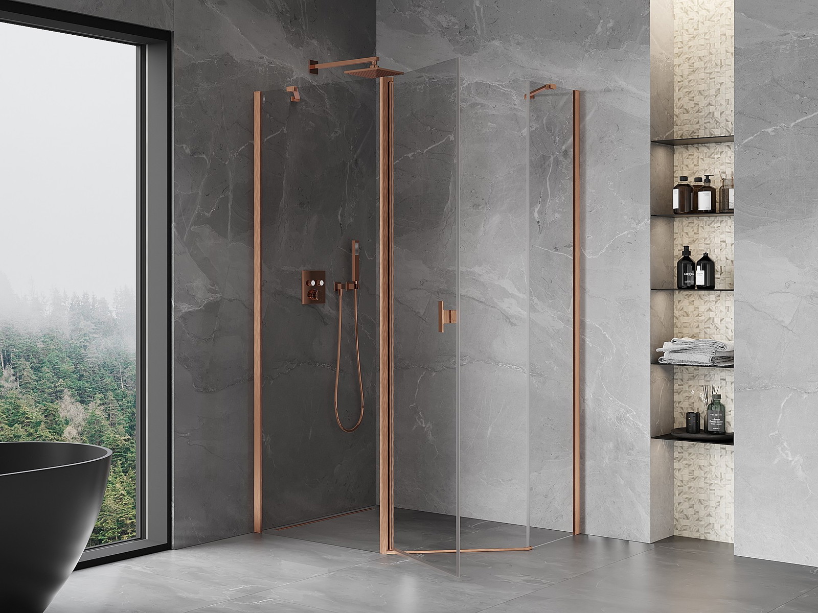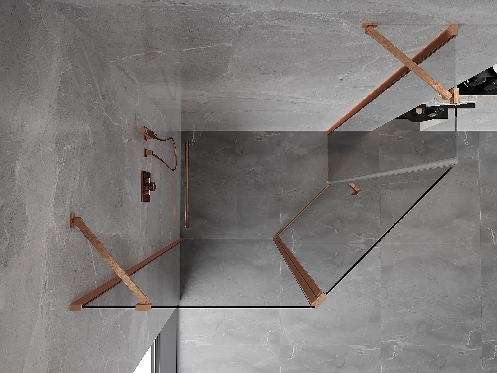 Mexen Mist asymmetrische vijfhoekige douchecabine, scharnierend 90 x 80 cm, transparant, geborsteld koper - 8A8-090-080-65-00