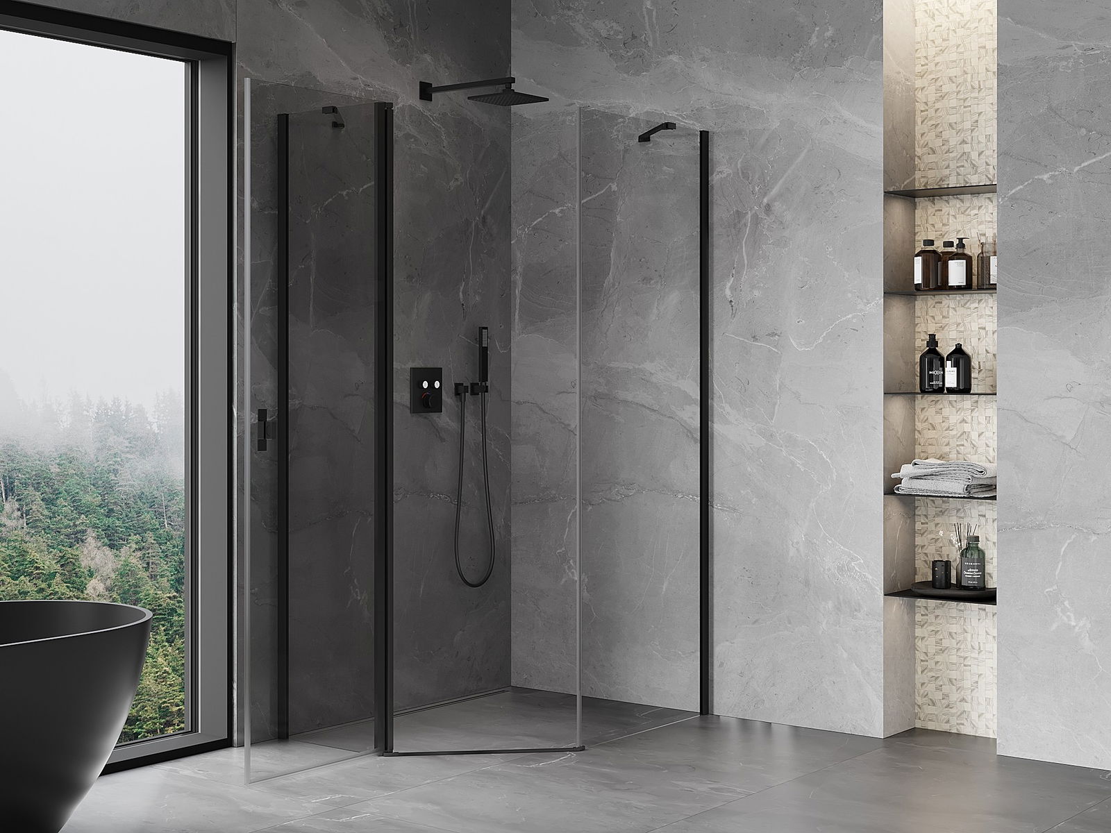 Mexen Mist vijfhoekige asymmetrische douchecabine scharnierend 80 x 90 cm, transparant, zwart - 8A8-080-090-70-00