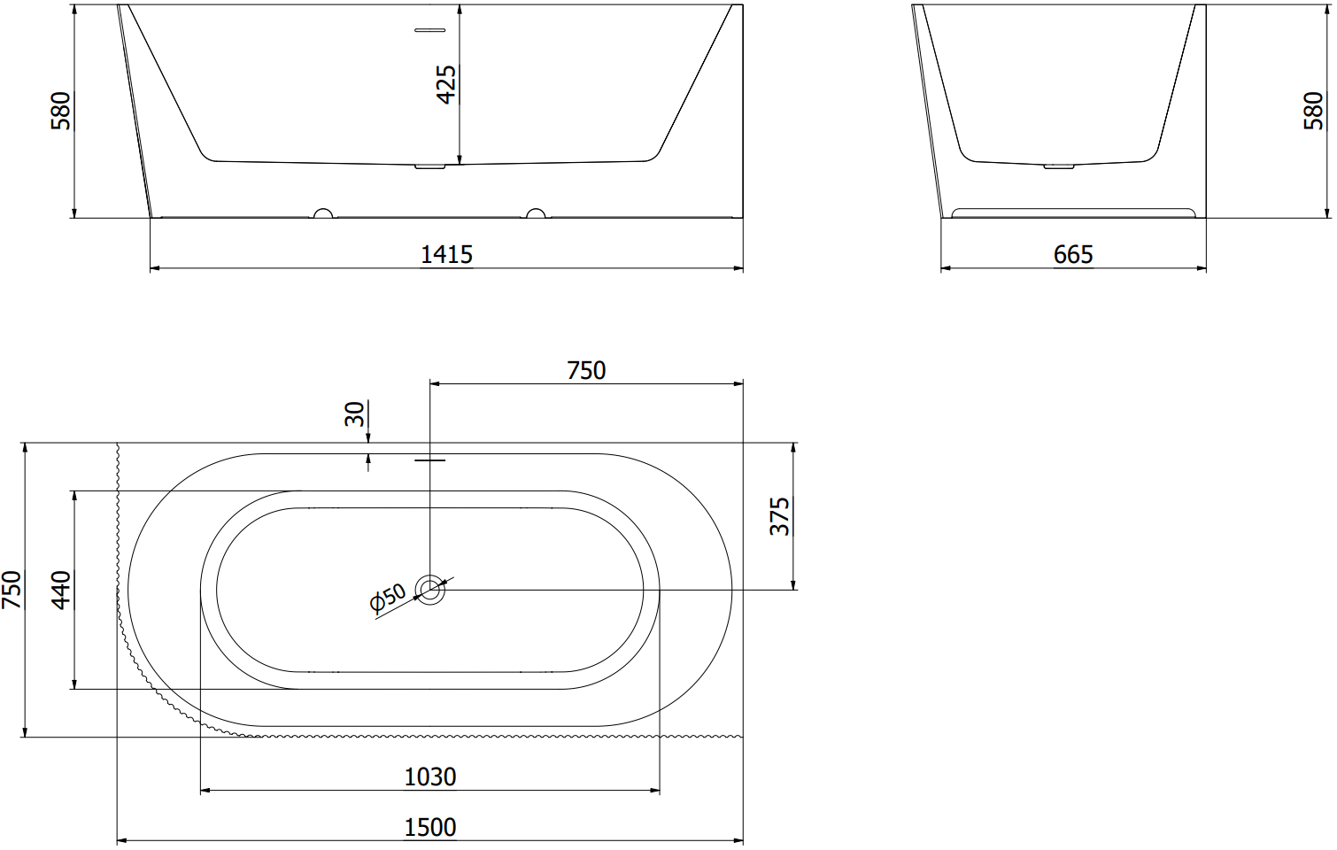 Mexen Silo vrijstaande hoekbadkuip rechts geribbeld 150 x 75 cm, wit/zwart, overloop gun metal - 52891507575P-95