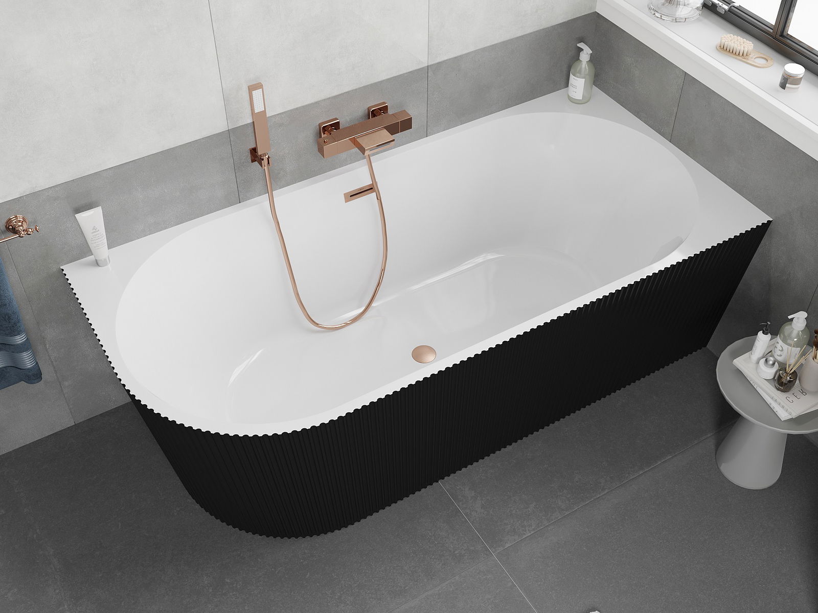 Mexen Silo vrijstaande hoekbadkuip rechts geribd 170 x 80 cm, wit/zwart, overloop geborsteld koper - 52891708075P-65