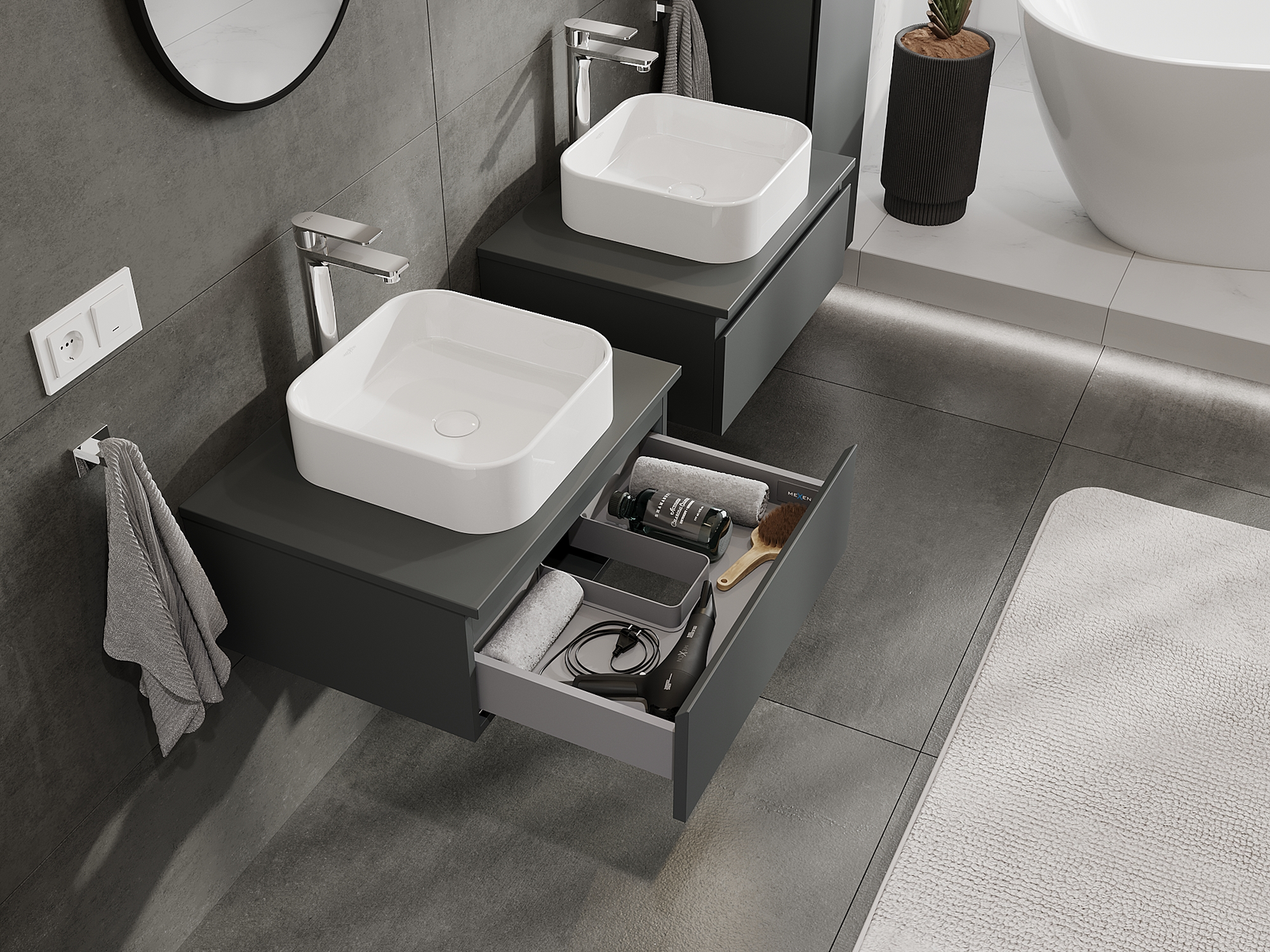 Onze modulaire badkamermeubels kunnen in verschillende kleurconfiguraties met elkaar worden gecombineerd, wat volledige personalisatie mogelijk maakt. Zowel het uiterlijk als de functies van de afzonderlijke elementen kunnen worden gekozen, waardoor de meubels kunnen worden aangepast aan persoonlijke stijlvoorkeuren en gebruikswensen.