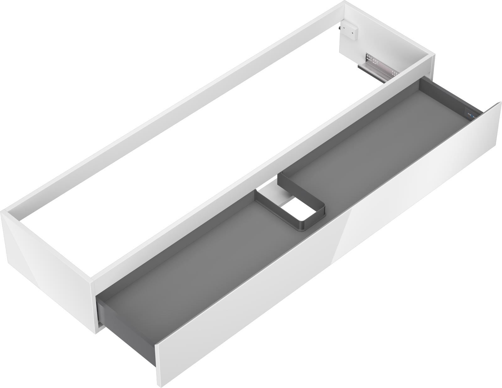 De uitsparing in de lade is zo ontworpen dat het de sifon kan bevatten, die noodzakelijk is in wastafelinstallaties. Hierdoor kan het meubel volledig functioneel worden gemonteerd, zonder dat er ruimte in de lade opgeofferd hoeft te worden voor installatiedoeleinden.