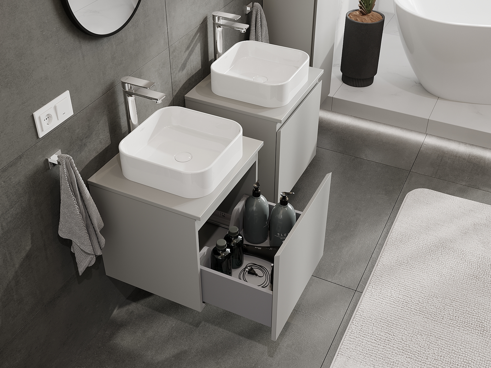 Onze modulaire badkamermeubels kunnen in verschillende kleurconfiguraties met elkaar worden gecombineerd, wat volledige personalisatie mogelijk maakt. Zowel het uiterlijk als de functies van de afzonderlijke elementen kunnen worden gekozen, waardoor de meubels kunnen worden aangepast aan persoonlijke stijlvoorkeuren en gebruikswensen.