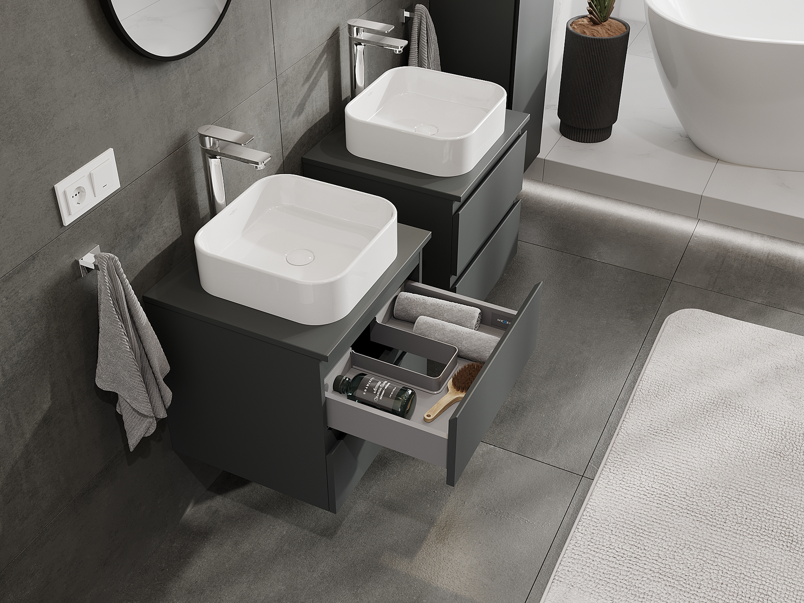 Onze modulaire badkamermeubels kunnen in verschillende kleurconfiguraties met elkaar worden gecombineerd, wat volledige personalisatie mogelijk maakt. Zowel het uiterlijk als de functies van de afzonderlijke elementen kunnen worden gekozen, waardoor de meubels kunnen worden aangepast aan persoonlijke stijlvoorkeuren en gebruikswensen.