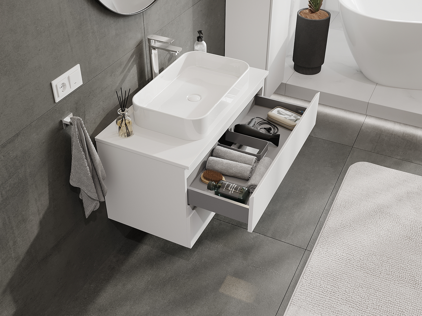 Onze modulaire badkamermeubels kunnen in verschillende kleurconfiguraties met elkaar worden gecombineerd, wat volledige personalisatie mogelijk maakt. Zowel het uiterlijk als de functies van de afzonderlijke elementen kunnen worden gekozen, waardoor de meubels kunnen worden aangepast aan persoonlijke stijlvoorkeuren en gebruikswensen.