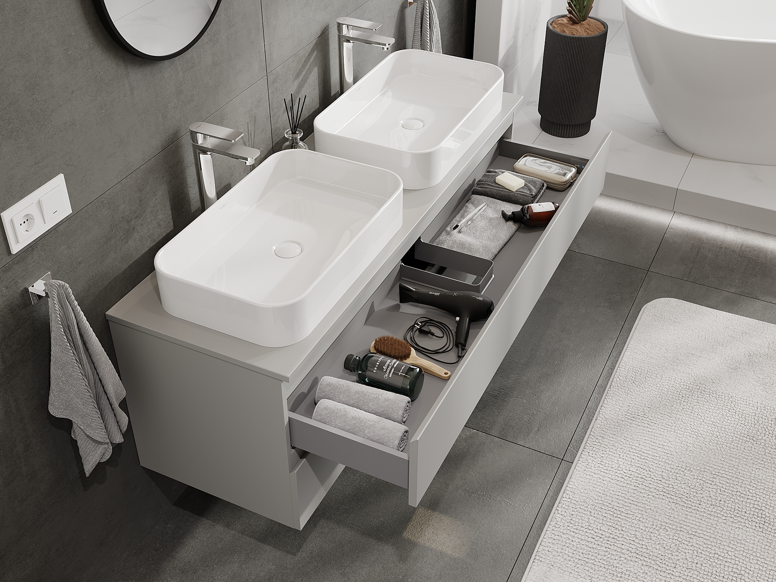 Onze modulaire badkamermeubels kunnen in verschillende kleurconfiguraties met elkaar worden gecombineerd, wat volledige personalisatie mogelijk maakt. Zowel het uiterlijk als de functies van de afzonderlijke elementen kunnen worden gekozen, waardoor de meubels kunnen worden aangepast aan persoonlijke stijlvoorkeuren en gebruikswensen.