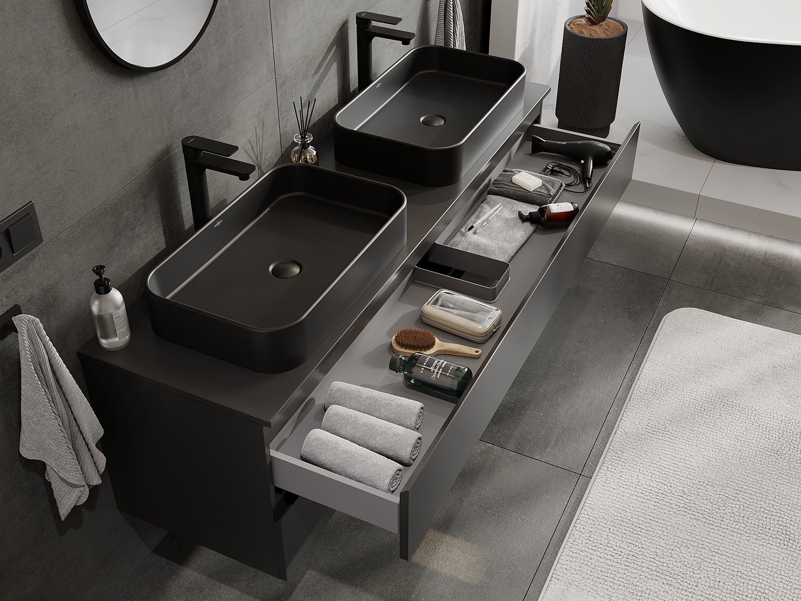 Onze modulaire badkamermeubels kunnen in verschillende kleurconfiguraties met elkaar worden gecombineerd, wat volledige personalisatie mogelijk maakt. Zowel het uiterlijk als de functies van de afzonderlijke elementen kunnen worden gekozen, waardoor de meubels kunnen worden aangepast aan persoonlijke stijlvoorkeuren en gebruikswensen.
