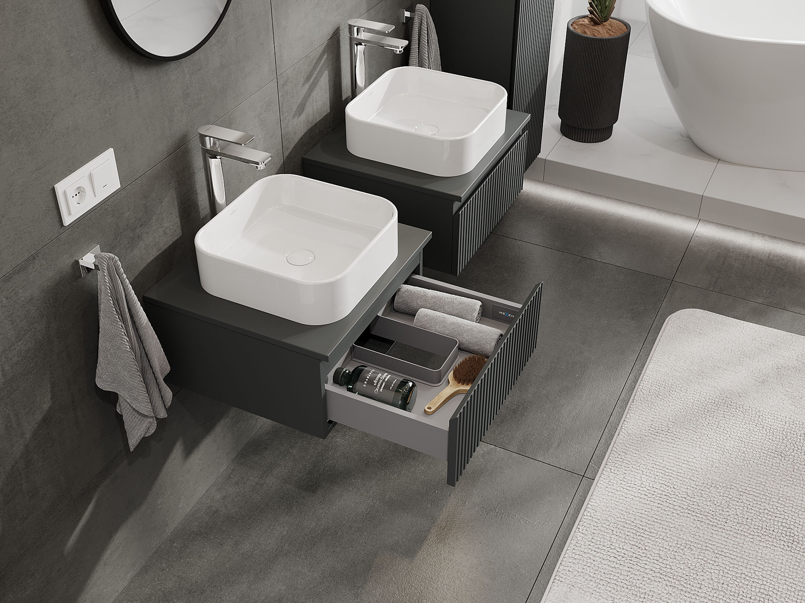 Onze modulaire badkamermeubels kunnen in verschillende kleurconfiguraties met elkaar worden gecombineerd, wat volledige personalisatie mogelijk maakt. Zowel het uiterlijk als de functies van de afzonderlijke elementen kunnen worden gekozen, waardoor de meubels kunnen worden aangepast aan persoonlijke stijlvoorkeuren en gebruikswensen.