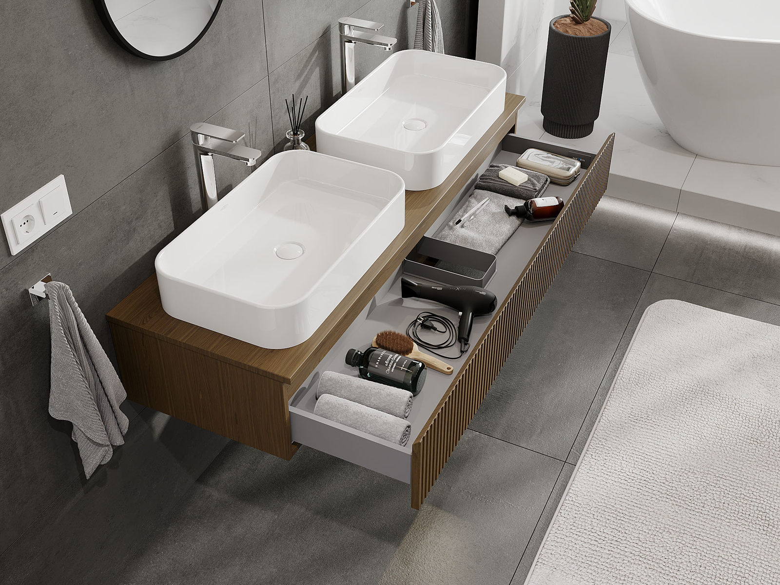 Onze modulaire badkamermeubels kunnen in verschillende kleurconfiguraties met elkaar worden gecombineerd, wat volledige personalisatie mogelijk maakt. Zowel het uiterlijk als de functies van de afzonderlijke elementen kunnen worden gekozen, waardoor de meubels kunnen worden aangepast aan persoonlijke stijlvoorkeuren en gebruikswensen.