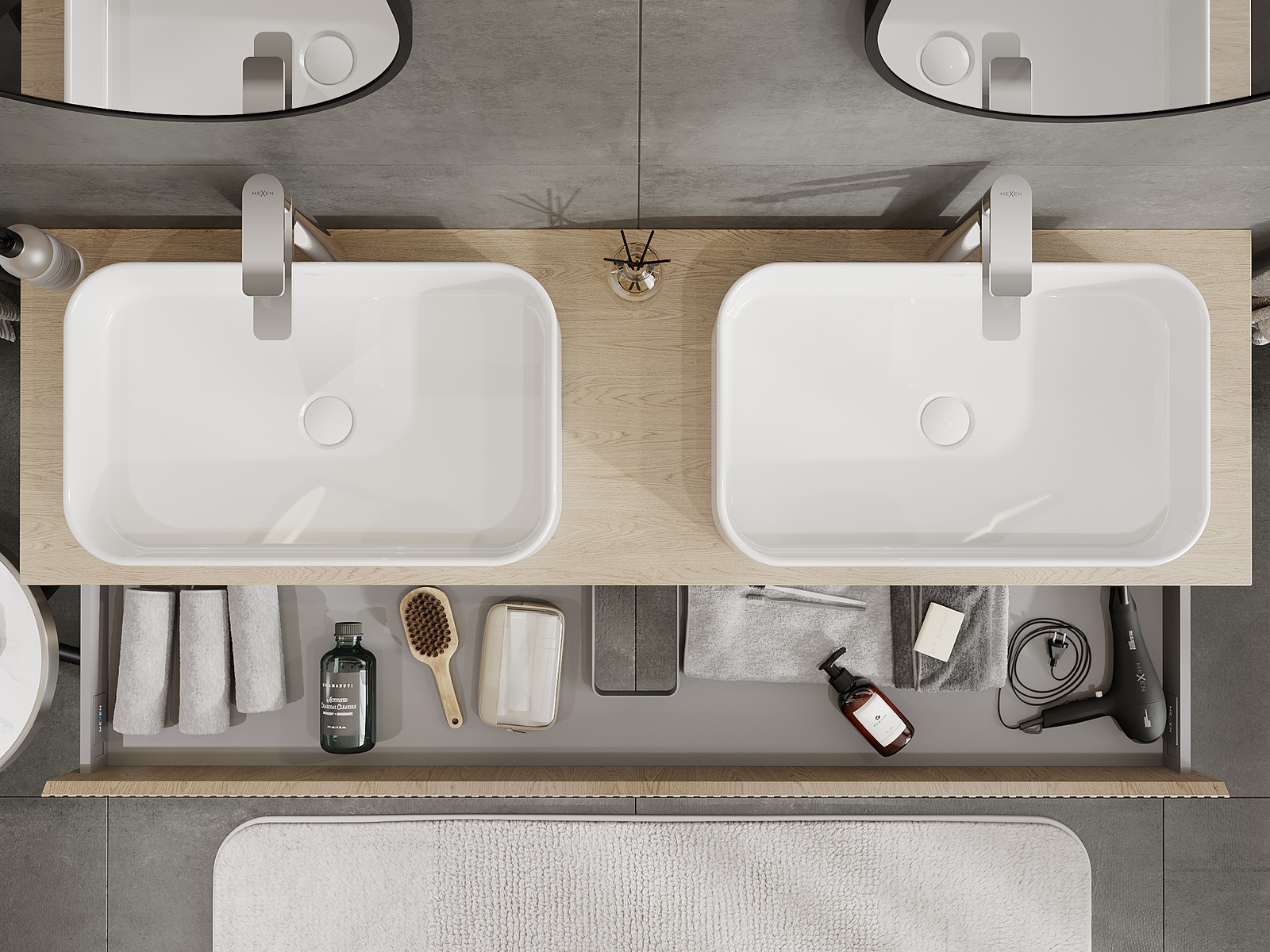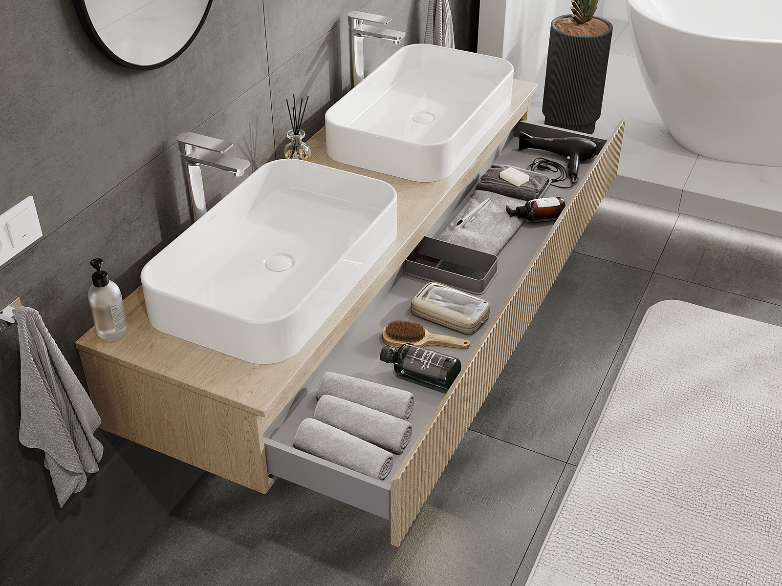 Onze modulaire badkamermeubels kunnen in verschillende kleurconfiguraties met elkaar worden gecombineerd, wat volledige personalisatie mogelijk maakt. Zowel het uiterlijk als de functies van de afzonderlijke elementen kunnen worden gekozen, waardoor de meubels kunnen worden aangepast aan persoonlijke stijlvoorkeuren en gebruikswensen.