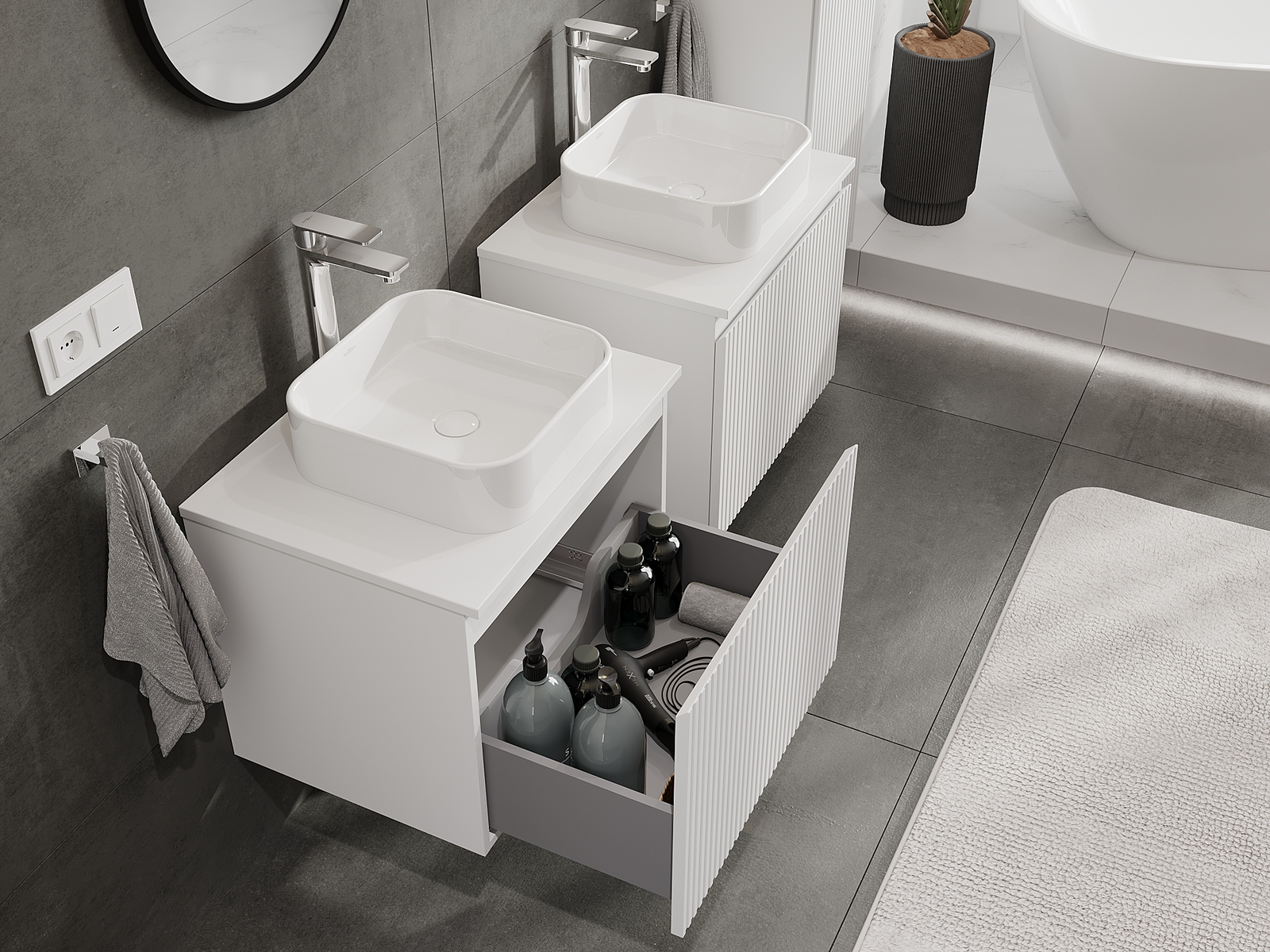 Onze modulaire badkamermeubels kunnen in verschillende kleurconfiguraties met elkaar worden gecombineerd, wat volledige personalisatie mogelijk maakt. Zowel het uiterlijk als de functies van de afzonderlijke elementen kunnen worden gekozen, waardoor de meubels kunnen worden aangepast aan persoonlijke stijlvoorkeuren en gebruikswensen.