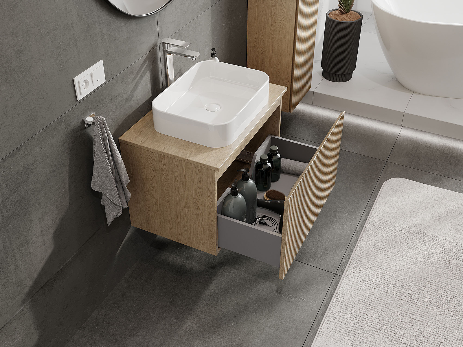 Onze modulaire badkamermeubels kunnen in verschillende kleurconfiguraties met elkaar worden gecombineerd, wat volledige personalisatie mogelijk maakt. Zowel het uiterlijk als de functies van de afzonderlijke elementen kunnen worden gekozen, waardoor de meubels kunnen worden aangepast aan persoonlijke stijlvoorkeuren en gebruikswensen.