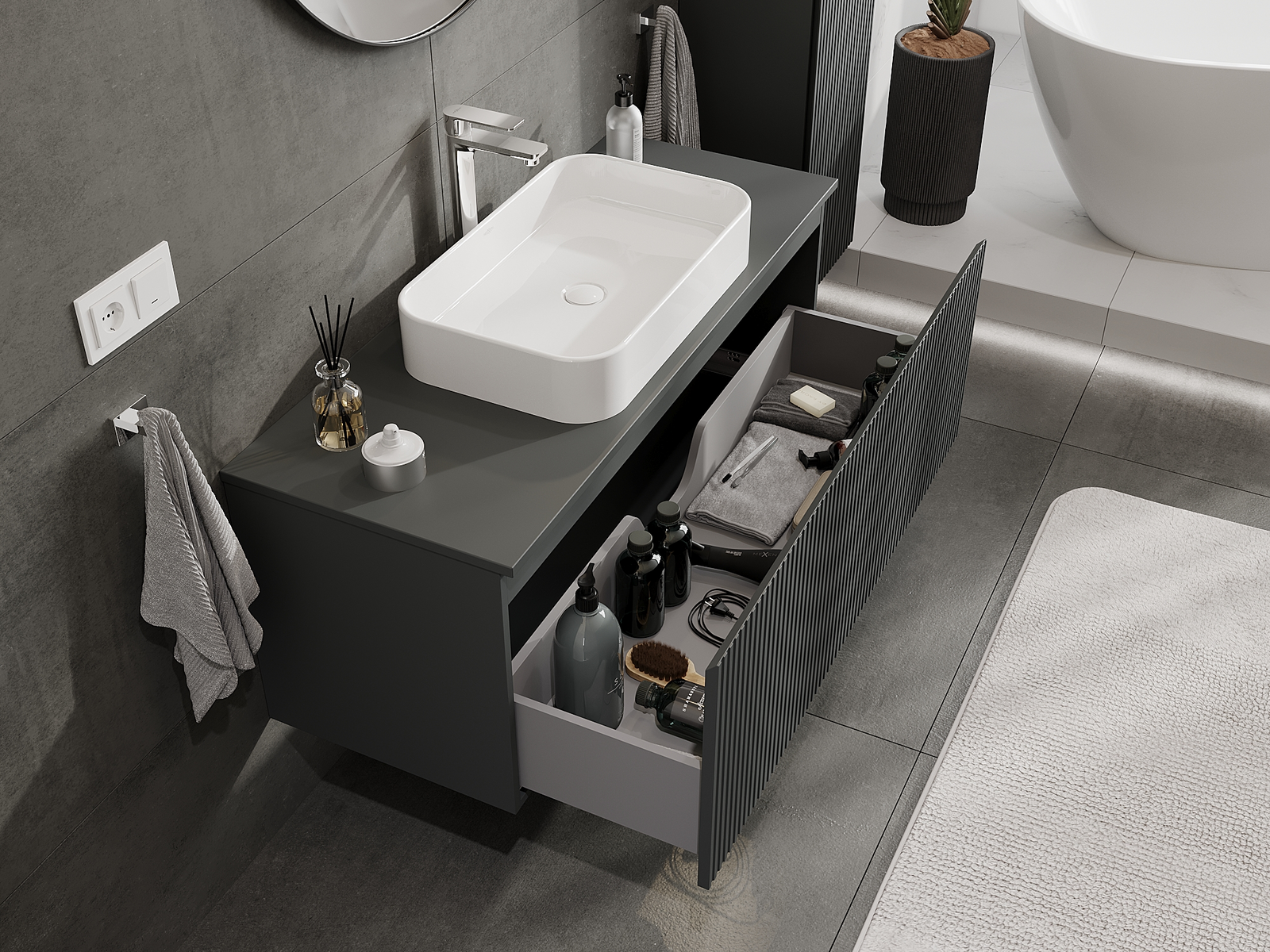 Onze modulaire badkamermeubels kunnen in verschillende kleurconfiguraties met elkaar worden gecombineerd, wat volledige personalisatie mogelijk maakt. Zowel het uiterlijk als de functies van de afzonderlijke elementen kunnen worden gekozen, waardoor de meubels kunnen worden aangepast aan persoonlijke stijlvoorkeuren en gebruikswensen.