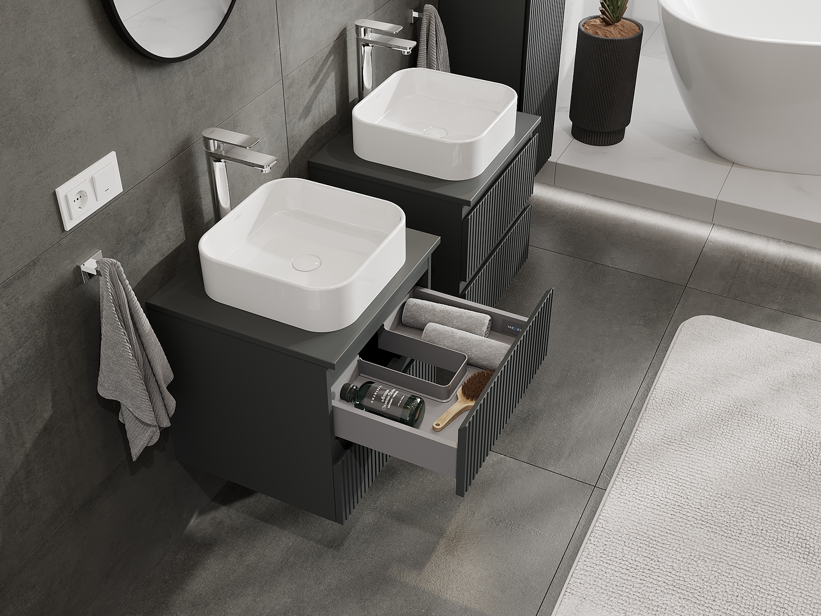 Onze modulaire badkamermeubels kunnen in verschillende kleurconfiguraties met elkaar worden gecombineerd, wat volledige personalisatie mogelijk maakt. Zowel het uiterlijk als de functies van de afzonderlijke elementen kunnen worden gekozen, waardoor de meubels kunnen worden aangepast aan persoonlijke stijlvoorkeuren en gebruikswensen.