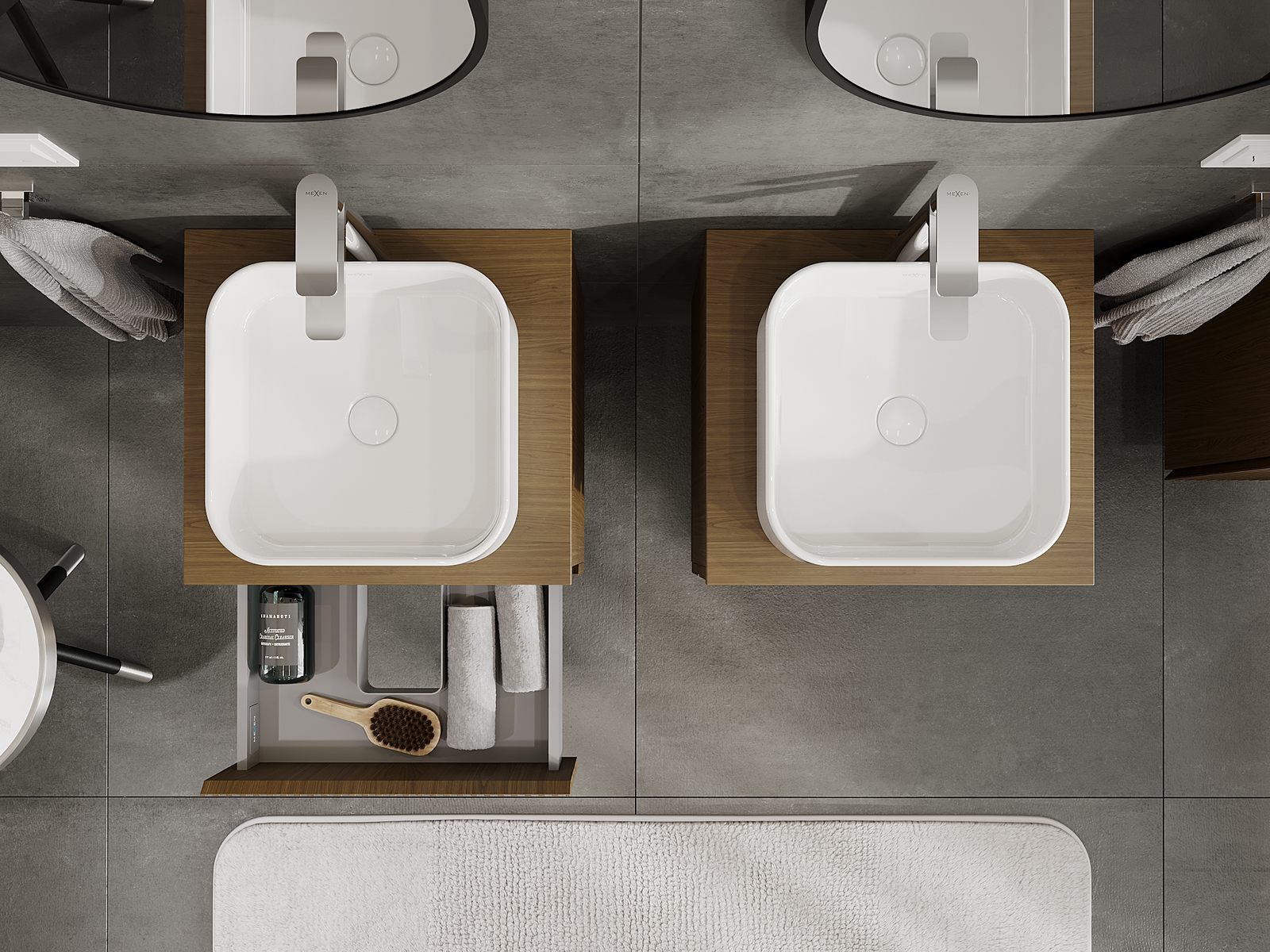 Onze modulaire badkamermeubels kunnen in verschillende kleurconfiguraties met elkaar worden gecombineerd, wat volledige personalisatie mogelijk maakt. Zowel het uiterlijk als de functies van de afzonderlijke elementen kunnen worden gekozen, waardoor de meubels kunnen worden aangepast aan persoonlijke stijlvoorkeuren en gebruikswensen.