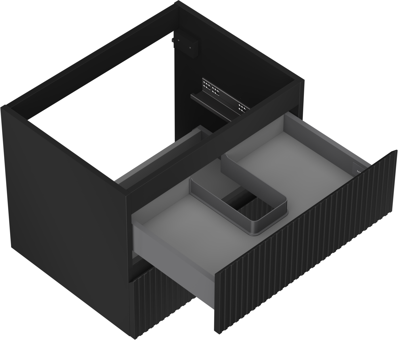 De uitsparing in de lade is zo ontworpen dat het de sifon kan bevatten, die noodzakelijk is in wastafelinstallaties. Hierdoor kan het meubel volledig functioneel worden gemonteerd, zonder dat er ruimte in de lade opgeofferd hoeft te worden voor installatiedoeleinden.