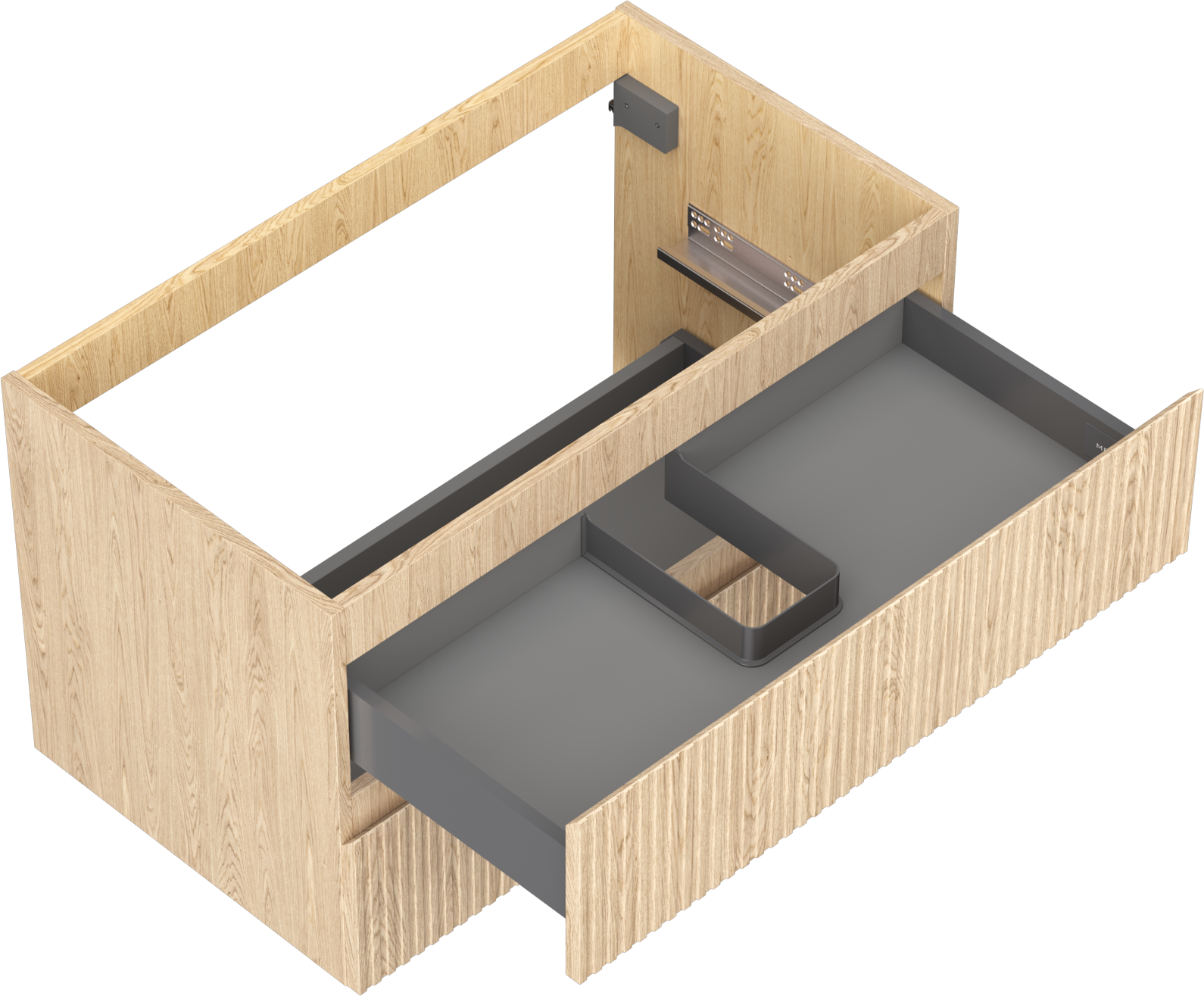 De uitsparing in de lade is zo ontworpen dat het de sifon kan bevatten, die noodzakelijk is in wastafelinstallaties. Hierdoor kan het meubel volledig functioneel worden gemonteerd, zonder dat er ruimte in de lade opgeofferd hoeft te worden voor installatiedoeleinden.