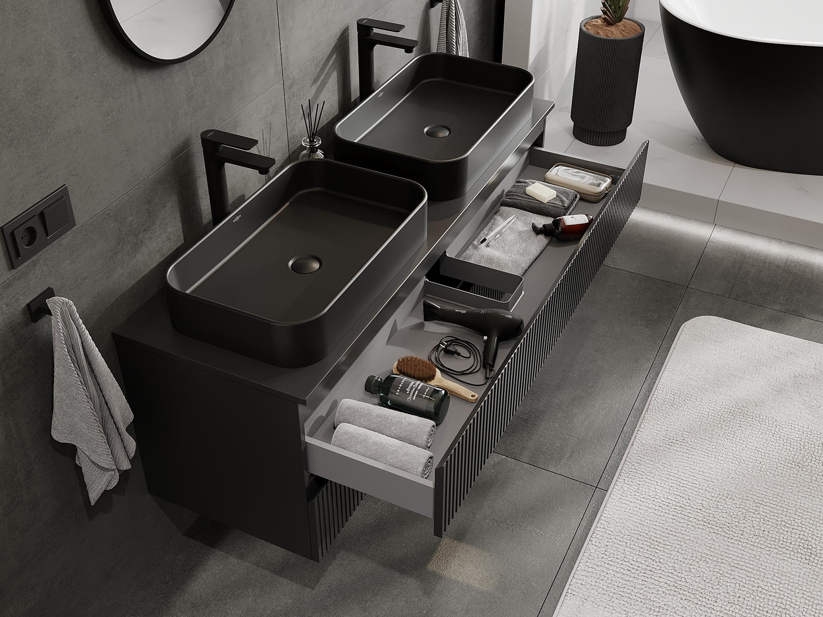 Onze modulaire badkamermeubels kunnen in verschillende kleurconfiguraties met elkaar worden gecombineerd, wat volledige personalisatie mogelijk maakt. Zowel het uiterlijk als de functies van de afzonderlijke elementen kunnen worden gekozen, waardoor de meubels kunnen worden aangepast aan persoonlijke stijlvoorkeuren en gebruikswensen.