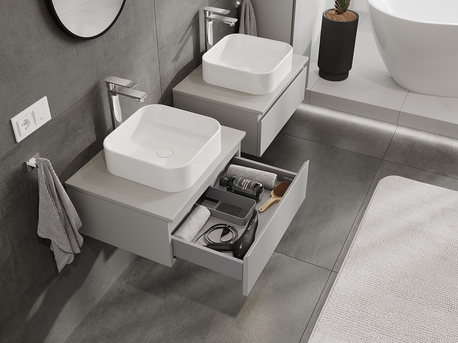 Onze modulaire badkamermeubels kunnen in verschillende kleurconfiguraties met elkaar worden gecombineerd, wat volledige personalisatie mogelijk maakt. Zowel het uiterlijk als de functies van de afzonderlijke elementen kunnen worden gekozen, waardoor de meubels kunnen worden aangepast aan persoonlijke stijlvoorkeuren en gebruikswensen.
