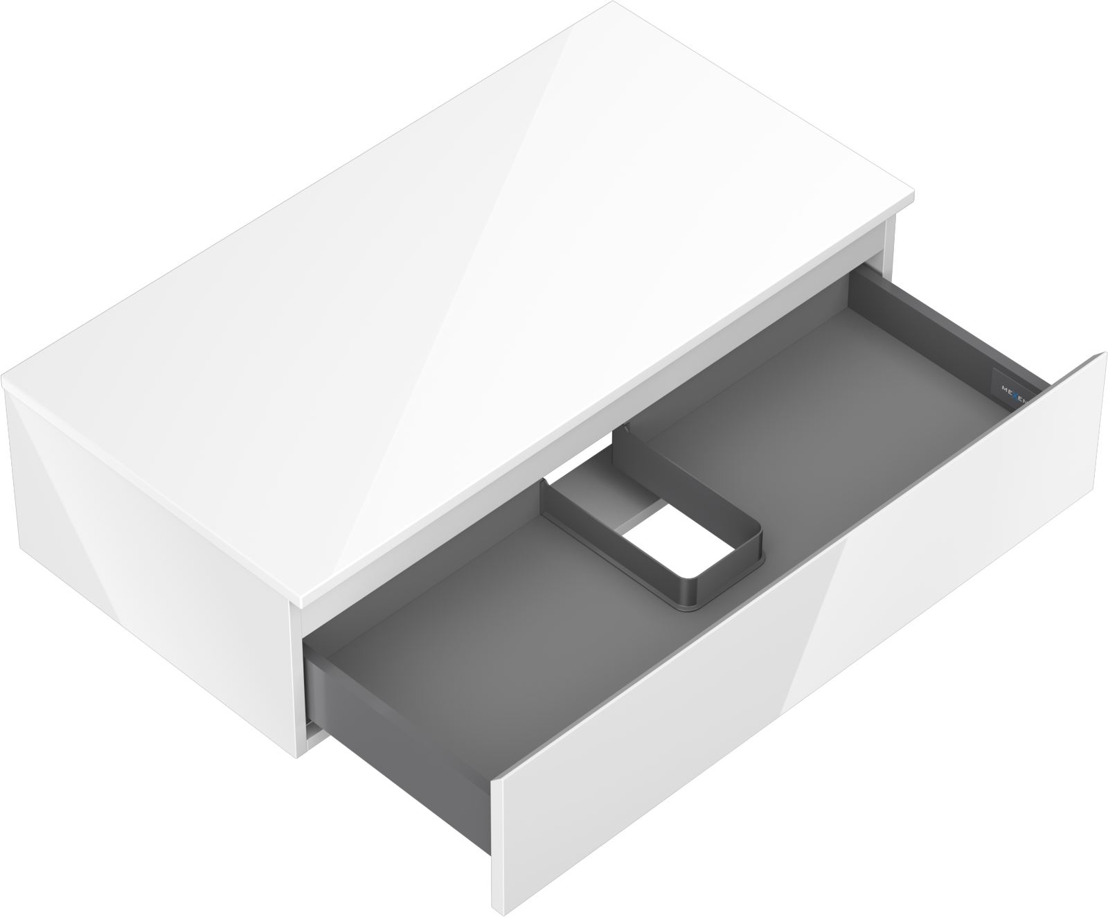 De uitsparing in de lade is zo ontworpen dat het de sifon kan bevatten, die noodzakelijk is in wastafelinstallaties. Hierdoor kan het meubel volledig functioneel worden gemonteerd, zonder dat er ruimte in de lade opgeofferd hoeft te worden voor installatiedoeleinden.