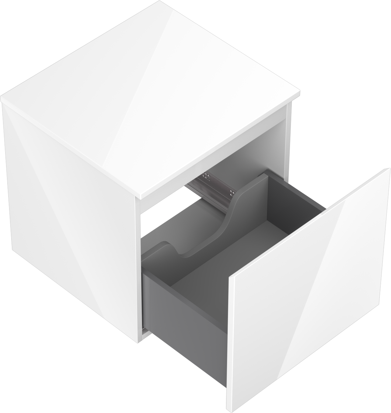De uitsparing in de lade is zo ontworpen dat het de sifon kan bevatten, die noodzakelijk is in wastafelinstallaties. Hierdoor kan het meubel volledig functioneel worden gemonteerd, zonder dat er ruimte in de lade opgeofferd hoeft te worden voor installatiedoeleinden.