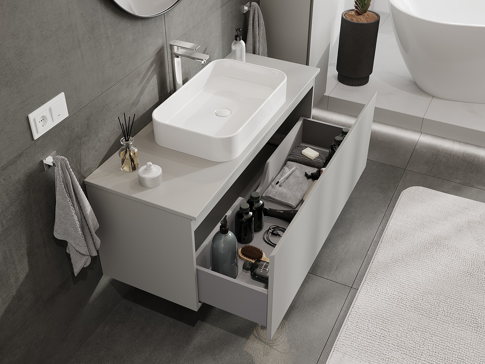 Onze modulaire badkamermeubels kunnen in verschillende kleurconfiguraties met elkaar worden gecombineerd, wat volledige personalisatie mogelijk maakt. Zowel het uiterlijk als de functies van de afzonderlijke elementen kunnen worden gekozen, waardoor de meubels kunnen worden aangepast aan persoonlijke stijlvoorkeuren en gebruikswensen.