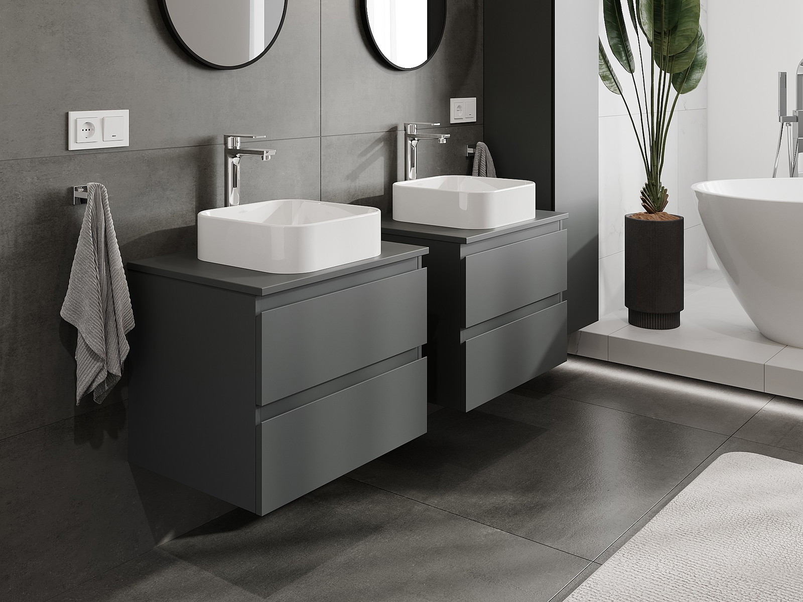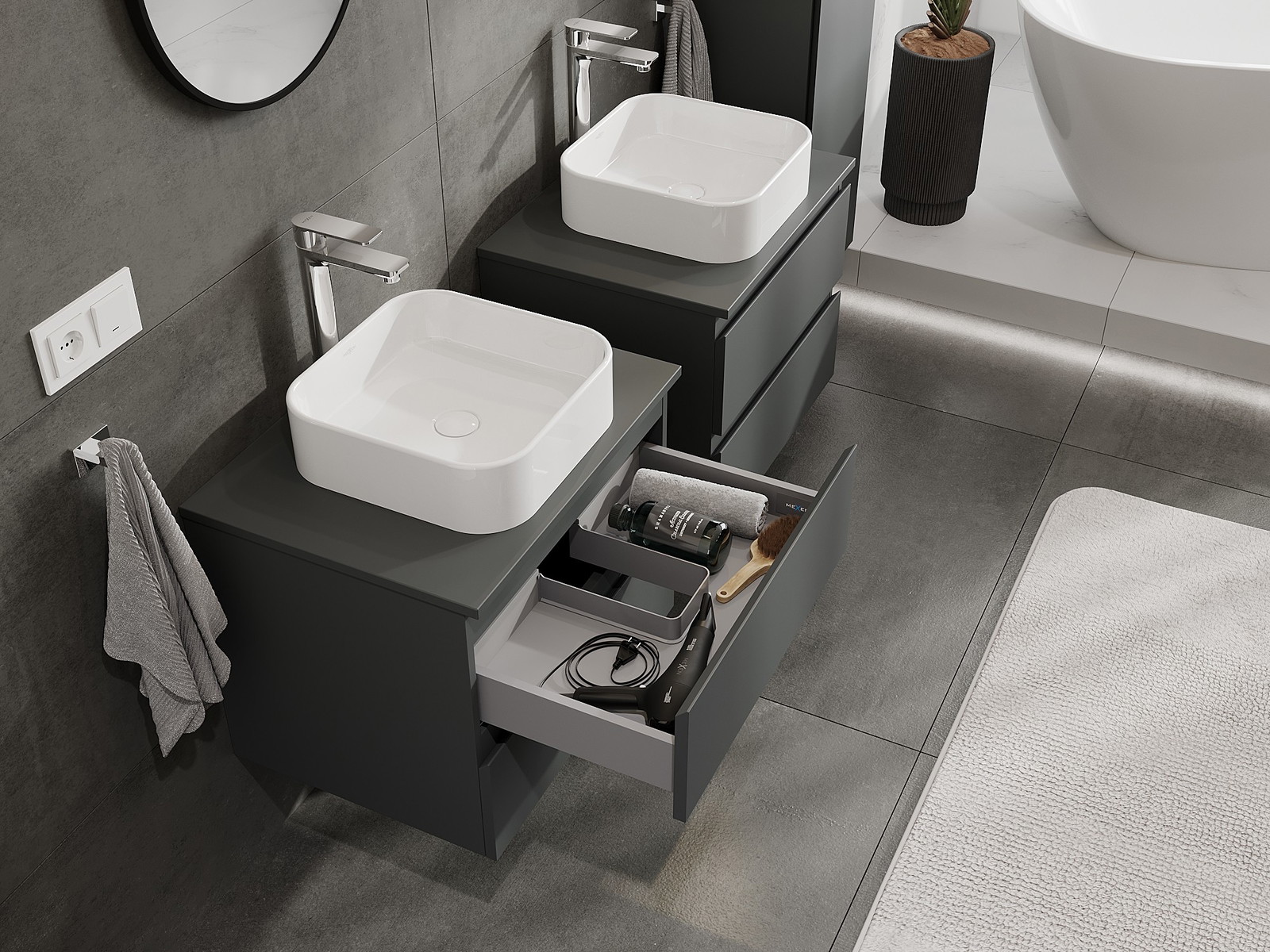 Onze modulaire badkamermeubels kunnen in verschillende kleurconfiguraties met elkaar worden gecombineerd, wat volledige personalisatie mogelijk maakt. Zowel het uiterlijk als de functies van de afzonderlijke elementen kunnen worden gekozen, waardoor de meubels kunnen worden aangepast aan persoonlijke stijlvoorkeuren en gebruikswensen.